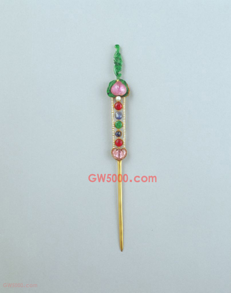 金镶宝石桃蝠簪,清,长17.5厘米,最宽2厘米。 金簪一端呈长针状,另一端以各色宝石等为饰,计有蓝宝石、红宝石、翠、珍珠以及碧玺。其中碧玺分别做成蝙蝠和桃实,另有一只翠蝙蝠。 簪子是古代妇女头上的装饰品。清代妇女尤其喜用发簪、大头簪、耳挖簪等,种类繁多,做工精致。红、蓝宝石都是以色命名的刚玉类宝石,属三方晶系,单晶呈柱状、桶状或近似腰鼓状,化学成分为氧化铝,硬度为9,密度为3.95-4.40,有透明、半透明、不透明三类,颜色以鸽子红、石榴红最为名贵。主要产自东南亚、印度、澳大利亚、巴西等地。古代,红宝石一直被用作护身符、辟邪符和装饰品。我国清代,红宝石还被用作亲王及一品官的顶戴标志。宝石名。据传源于波斯语“披及札基”的谐音,所以古时又称披耶西、碧霞玺、碧霞玭、碧霞希及碧洗等,即今日的“电气石”宝石。古籍记载碧玺产于缅甸,现我国新疆、内蒙古等地的伟晶岩中均产有各色碧玺,其中以新疆阿勒泰所产碧玺最为著名。