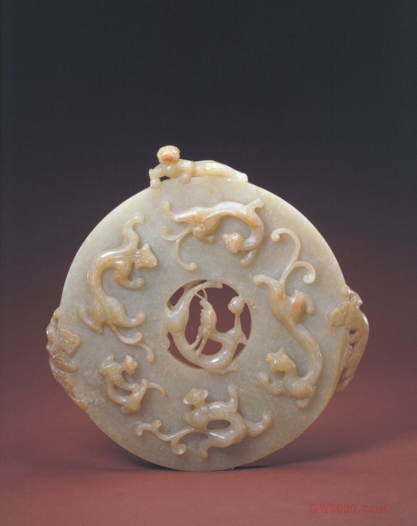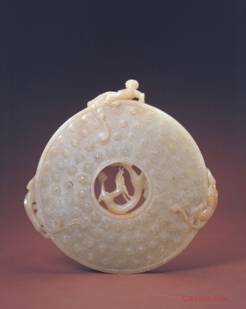 玉九螭璧,明,直径20.4厘米,孔径5.8厘米,厚2厘米。清宫旧藏。