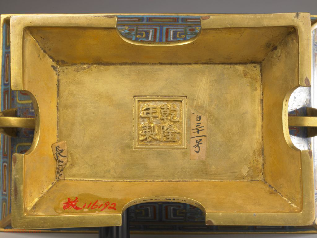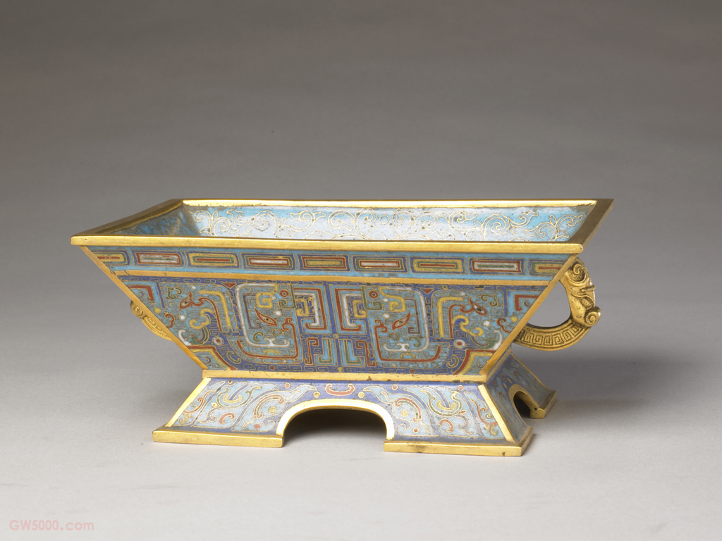 乾隆款掐丝珐琅饕餮纹簠,清乾隆,高8.3厘米,长13.2厘米,宽19.6厘米。清宫旧藏。 簠作长方形,铜鎏金兽吞式双耳,高足外撇。簠的四面均饰互为对应的饕餮纹,口边饰回纹,足边饰卷云纹。器里蓝地卷草纹。足内錾“乾隆年制”阳文楷书款。 此器造型仿商周青铜簠,色彩纯正,造型规整,胎壁厚重,鎏金光亮,为乾隆朝标准器。俗称“景泰蓝”。以红铜作胎,将很细的铜扁丝掐成花纹后用药焊于器表,再以随类附彩的方法将珐琅釉料填进丝间,经焙烧、打磨、镀金而成。 珐琅,又称“佛郎”“法蓝”“琺瑯”,是一外来语的音译词。珐琅的基本成分为石英、长石、硼砂和氟化物,与陶瓷釉、琉璃、玻璃(料)同属硅酸盐类物质。中国古代习惯将附着在陶或瓷胎表面的称“釉”;附着在建筑瓦件上的称“琉璃”;而附着在金属表面上的则称为“珐琅”。 金属胎珐琅器则依据在制作过程中具体加工工艺的不同,可分为掐丝珐琅器、錾胎珐琅器、画珐琅器和透明珐琅器等几个品种。传说中龙生九子,饕餮便是其中之一,特点是极其贪食。《说文解字》释其为:“饕,乃贪嗜财货饮食之意。贪食每较贪财为甚,以食盖财,故从食。餮,为大张其口以人财货纳饮食,故从飧声。”《吕览·先识》中说:“饕餮,恶兽名。古代钟鼎彝器,多琢其以为饰。周鼎著饕餮,有首无身,食人未咽,害及其身,以言报更也。” 虽然饕餮纹大多铸于青铜器,但玉器、瓷器等上也有不少饕餮纹。有的作品只琢刻鼻以上的部分,无口与颏,寓意节食戒贪。 家具上常用的纹饰之一,由陶器和青铜器上的雷纹衍化而来,寓意吉利深长,苏州民间称之为“富贵不断头”。在家具上,回纹主要作为边饰,用于边框、牙条、足端或束腰等处。家具上大量采用回纹见于清代。篆刻的一种方式,即把印文镌成凸状,在纸上钤盖时印文是红色,因而又称为朱文。 陶瓷器装饰纹饰之一,为最早出现的缠枝纹,枝叶蔓卷,相缠成带状。始见于南北朝时期的陶瓷器上,隋、唐两代盛行。一般与莲瓣纹组合,成为佛教艺术装饰题材之一。后人将忍冬纹归于卷草纹范畴。