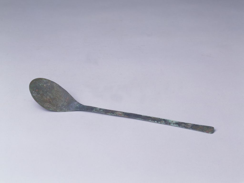 平勺长柄,微曲。通体饰有花纹,主体部位饰一兽纹,柄饰鱼纹。纹饰均为极细的单线刻成。取食器,用如今天的匙子。考古发现的匕常与鼎、鬲同出。勺为取酒浆之器,《说文》:“勺,枓也,所以挹取也。”勺与斗作用相似。以鱼与余同音,寓意“富贵有余”、“连年有鱼”。宋代南北各窑已多有用此题材,在元代景德镇、吉州、磁州、龙泉各窑制品中亦常见,至明清彩瓷中使用更为广泛。鱼或单或双,或三五追逐,鱼水相融。