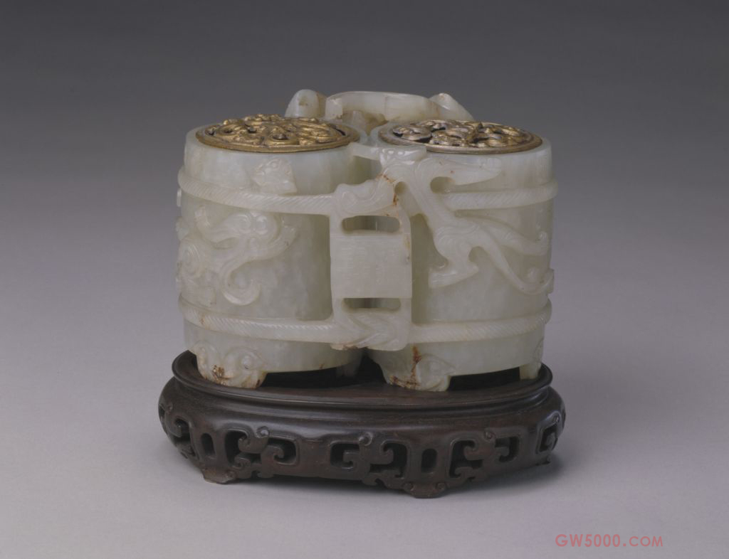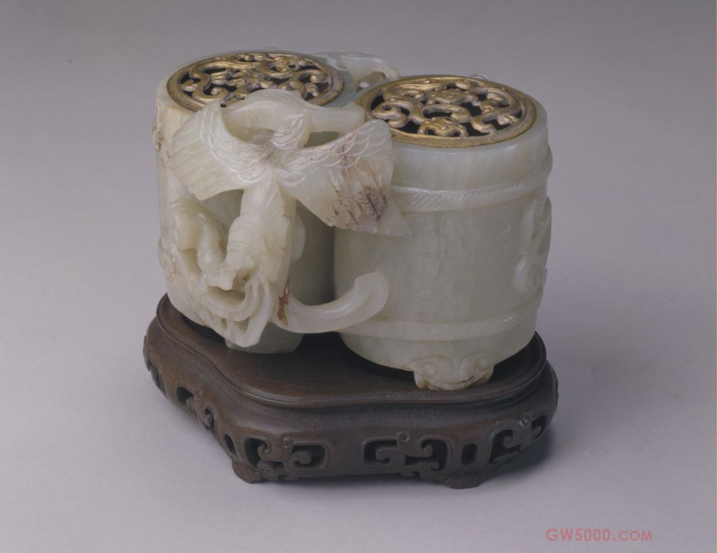 古时“合卺”多指婚姻之事,合卺杯亦应为大婚所用。此杯署“子刚制”款,陆子刚为明晚期治玉名家,与祝允明为同时代人,他的作品多为后人所仿冒。即陆子刚。明晚期治玉名家。明代著作中对其有较多的记述,称其治玉为吴中绝技,上下百年保无敌手。陆子刚治玉高峰期约在明嘉靖至万历年间,其作品当时即为富贾、权贵们追寻和收藏。卺(音紧),是把瓠一分为二。旧时指婚礼上夫妇饮交杯酒。《礼记·昏仪》谓:“共劳而食,合卺而酳”。也称绳纹。是由两条、四条或更多的线条扭结成绳索状的纹饰。