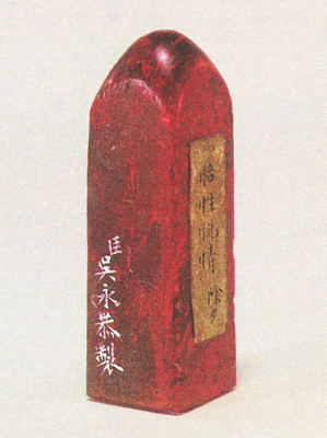 “怡情悦性”印,清晚期,鸡血石质,随形光素方形印,汉文篆书。面1.8厘米见方,通高5.8厘米。边款“臣吴永恭制”。 慈禧太后所用闲章。从边款可知此印为吴永刻制进呈之物。吴永,浙江吴兴人,同治四年(1865)生,童年时家道殷实,先后就读于刘复初、郭绍先、郭嵩焘等名师。“涉猎经史之余,工绘事,通音律,摹刻汉印,古茂有致,雅俊称于时”,曾“鬻书画镌刻以自给”。光绪二十六年(1900),八国联军攻入北京,慈禧太后携光绪帝仓惶出逃,经山西而到西安,“间关道途,昼餐无糗糒,夕休无床榻,饥寒羸瘁”,情状落魄。幸亏当时任怀来知县的吴永途中迎驾,服侍恭谨有加,才使窘况稍有好转。吴永因此深得慈禧太后宠信,被任命为前路粮台会办,随扈西行。擢升知府,准专折奏事,宠冠群僚,朝里尽为侧目。此玺大概就是慈禧太后从西安回銮以后吴永刻治进献的。 鸡血石是辰砂条带的地开石,其颜色像鸡血一样鲜红,所以人们俗称鸡血石。我国最早发现的鸡血石是浙江昌化玉岩山鸡血石。府级行政机构之长官。宋代始置,称“知某府事”,简称“知府”。掌教化百姓,劝课农桑,甄别孝悌,奉行法令条制,宣读赦书,举行祀典,考察属官,赈济灾伤,安集流亡以及赋役、钱谷、狱讼等事。视本府地望高下,或兼留守司公事,或兼安抚使、都总管、巡检等职务,总理本府兵民之政。明代始以知府为正式名称,掌管一府政令,总核所属州县之赋役、诉讼等事,汇总于布政司、按察司。清之各府,以冲、繁、疲、难四字分定等第,划为最要缺、中缺、减缺。各府调补知府时,有“请旨缺”、“题补缺”、“调补缺”、“留补缺”之分。应升、应补官员也按为官情况划分等第,以求人、缺相宜。
