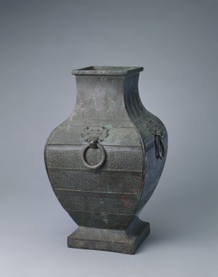 此壶为清宫旧藏文物,原藏颐和园。方壶,中国古代传说中的三座神山之一,也称为“方丈”。《史记·秦始皇本纪》载:“齐人徐市等上书,言海中有三神山,名曰蓬莱、方丈、瀛洲,仙人居之。”又《封禅书》云:“自威、宣、燕昭,使人入海求蓬莱、方丈、瀛洲。此三神山者,其传在渤海中,去人不远。患且至,则船风引而去。盖尝有至者,诸仙人及不死之药皆在焉。其物、禽兽尽白,而黄金、银为宫阙。未至,望之如云,及到,三神山反居水下。临之,风辄引去,终莫能至云。”又晋人王嘉所撰《拾遗记》卷一称,三座神山由于其形如壶器,又分别被称为方壶、蓬壶、瀛壶,并称“三壶”。盛酒器,亦可盛水。《仪礼·聘礼》:“八壶设于西序”。注:“酒尊也。”《周礼·挈壶氏》:“掌挈壶以令军井”。注:“盛水器也。”殳季良父壶铭:“用盛旨酒。”伯陭壶铭:“用自作醴壶。”都十分清楚地说明了壶在青铜礼器组合中的用途。青铜壶的制作上起殷商,下至秦汉,商代前期方壶较少见,随着时代的变迁,形制也不断变化,大多为圆形。
