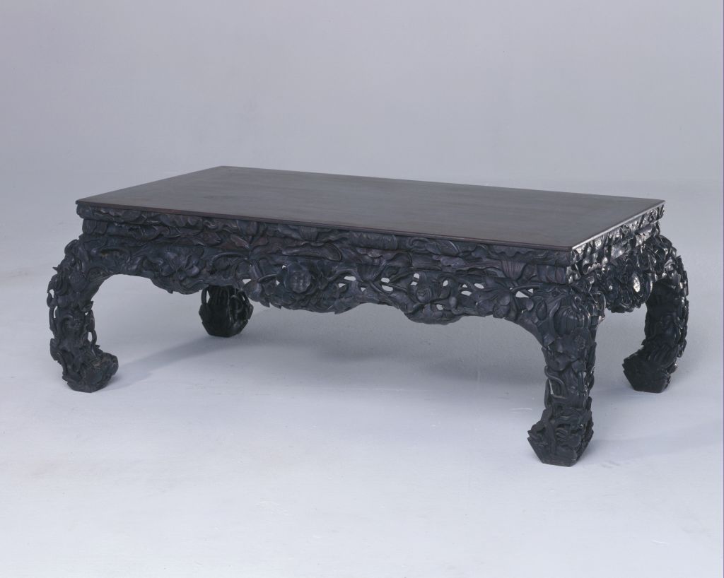 清中晚期,高32厘米,长90厘米,宽50厘米 。 炕桌紫檀木质。桌面下有束腰,鼓腿膨牙,内翻马蹄足。除桌面外,其余部位皆雕荷花纹。此件炕桌的牙条富有时代特征,牙条上不但雕满荷花,而且做成洼堂肚的形式,此为清式家具典型的装饰手法。这种透雕花卉的鼓腿膨牙、内翻马蹄的装饰方法十分费料,通常所用料为直腿做法用料的几倍。此件炕桌属于清代中晚期的作品。在炕上使用的矮形桌案。此种家具形体不大,且四足较低,故又称矮桌。紫檀木是世界上最名贵的木材之一,主要产于南北回归线之间的热带、亚热带地区,我国广东、云南等地有少量出产。其木质坚硬,体重,入水即沉,没有疤痕,呈紫黑色。紫檀木生长缓慢,非数百年不能成材,故极珍贵。紫檀木的纹理纤细浮动,变化无穷,其色调深沉,显得稳重、大方、美观。《博物要览》称:“新者色红,旧者色紫,有蟹爪纹,新者以水浸之,可染物。”我国古代使用紫檀木制作器物历史悠久,东汉末年已见于记载,唐代宫廷中亦有使用紫檀木的记载。至明代,紫檀木更是受到皇家的宠爱。清代,紫檀木大量进入宫廷中,为内务府造办处用于制作清宫家具及文玩之器的必备材料,同时一些富商大贾之家也多使用名贵的紫檀木制造家具及生活用品。 束腰,明清家具部件名称。原是须弥座上枭与下枭之间的部分,在家具上指面框和牙条之间缩进的部。束腰是我国传统家具造型的典型式样之一。带束腰家具中常见的一种装饰手法。四腿自束腰下向外鼓出,然后又向内兜转,形成内翻马蹄状,牙板亦随腿的弧度向外膨出。 明清家具的腿足装饰,足端向里翻称“内翻马蹄”,向外翻称“外翻马蹄”。很多家具在立木与横木的支架交角处多运用形式不同的牙子来装饰。这种牙子中长而直的称为牙条。清式家具的装饰手法之一,牙条正中下垂的曲边装饰线角称为“洼堂肚”。 雕刻技法之一。一种是在浮雕的基础上镂空背景部分,有单面雕、双面雕之分。另一种介于圆雕和浮雕之间,常用于民间床、窗、梁、护板的雕刻中。 古建筑彩画绘画的一种题材。清代中期之前多画绿叶子花卉,清代晚期画黑叶子花卉。