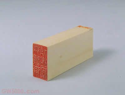 “无逸斋精鉴玺”,清末,牙质。通高7.75厘米,印面长3.1厘米,宽1.7厘米。清宫旧藏。 印为长方形,篆字二行各三字,阳文。印体光素,阴面刻工精细。 在紫禁城和畅春园均有无逸斋,溥仪在他的自传中记述说:“过不多天,我住的养心殿东套院无逸斋的窗户上又发现了火警,幸好发现得早,一团浸过煤油的棉花刚烧着,就被发现了,未致成灾。”只怕是溥仪记错了,他的这个小小的书房现已无存。此印常钤于溥仪鉴赏过的古书画上。篆刻的一种方式,即把印文镌成凸状,在纸上钤盖时印文是红色,因而又称为朱文。