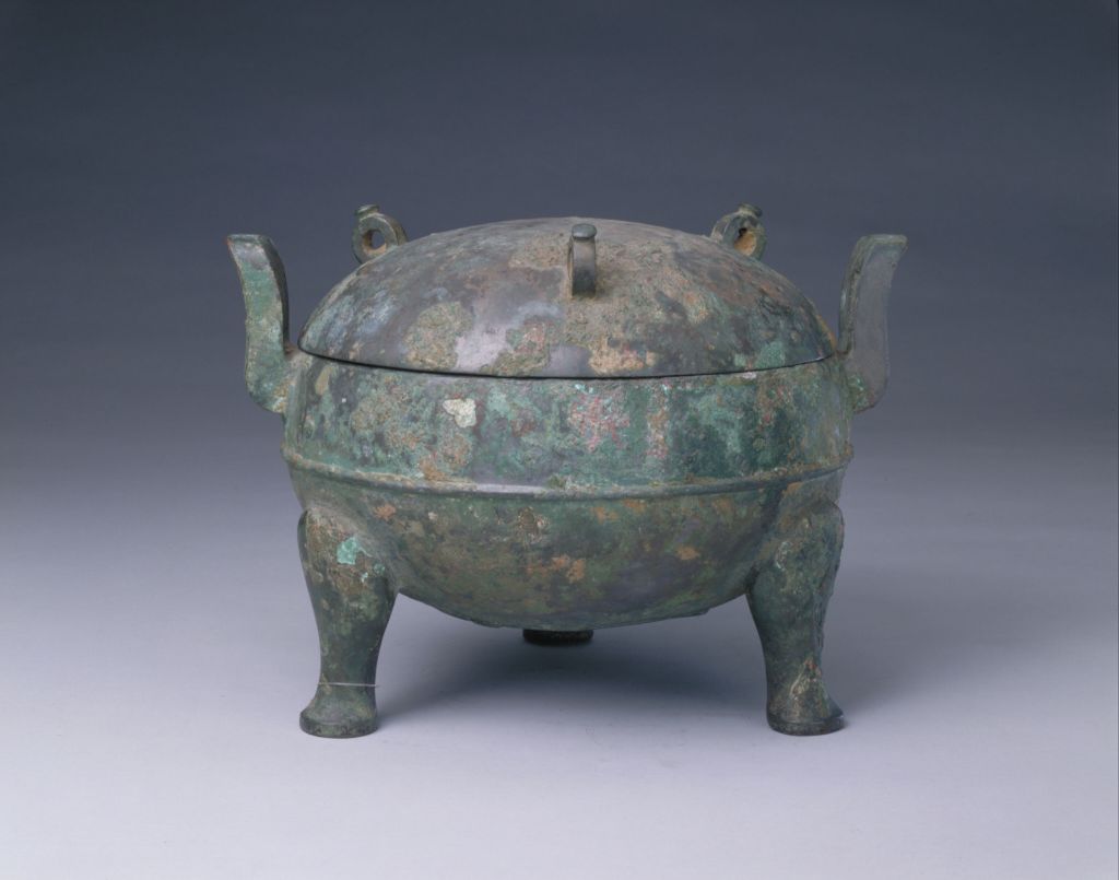 鼎为圆体,双附耳,三蹄形足,有盖,盖上饰三钮。器腹部以一棱状突起为饰。