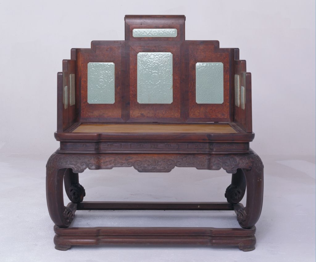 高106厘米,长91厘米,宽67厘米。 宝座靠背及扶手做成九屏风式,正中稍高,并向后呈卷舒式,两侧依次渐低。框内镶影木心,与边框齐平,中间凸嵌豆绿色暗花彩瓷片。座面藤心软屉,前沿连同束腰、牙条微内凹,束腰浮雕绦环,下衬托腮。牙条正中垂洼堂肚,浮雕缠枝莲纹。鼓腿膨牙内翻卷叶纹足,须弥式托泥座,带龟脚。整体比例匀称,加之工精材美,堪称清代家具精品。传统家具中一种体型宽大的坐具,亦称“御座”。明以后,随着皇权制度的强化,宝座成为帝王御用坐具的代名词,象征着帝王的权威。《明史》载,明神宗时,宦官冯保窃权,“帝御殿,保辄侍侧”。当时的吏部都给事中雒遵进言:“保一侍从之仆,乃敢立天子宝座,文武群工拜天子耶,抑拜见中官耶?”将宦官立于宝座之侧视为亵渎皇权的大不敬行为。 宝座大多摆放在宫廷正殿明间的中心或显要位置,单独陈设,极少成对。在宝座的背后还要放置一个较大的座屏,两边放置甪端、香筒、仙鹤、蜡钎等器物,格外尊贵、庄严。皇帝端坐在宝座之上,俯视群臣,“君临天下”,充分体现出帝王的权威,以达到“明制度,示等威”的目的。亦称欹床。中国传统家具中的一种坐具,现已很少见。其形式犹如椅子的靠背,是一种无座腿甚至无座面的坐具。其背后安有可以撑放的活动支架,可根据使用者的要求调节靠背的角度。它多在床榻上或席地使用。明高濂《遵生八笺》中说:“靠背以杂木为框,中穿细藤,如镜架然。高可二尺,阔一尺八寸,下作机扃,以准高低,置之榻上,坐起靠背,偃仰适情,甚可人意。”宋、明绘画中也可见到此种坐具。 屏风是我国古代室内的主要陈设器物。其最早的功能为挡风和遮避用。据《三礼图》记载:“屏风之名出于汉世,故班固之书多言其物。”以后随着工艺的进步,屏风逐渐由原来的实用品演进为实用性和装饰性结合的工艺品,成为古人居室内具有观赏性的陈设家具。屏风在清代发展尤盛,无论是所用材料还是工艺技术都达到了历史最高水平。 影木泛指树木根部木材。由于木材纹理千奇百怪,反映出多种不同影像特征,故称“影木”。用棕藤、丝绒或其它纤维编织的家具屉面。束腰,明清家具部件名称。原是须弥座上枭与下枭之间的部分,在家具上指面框和牙条之间缩进的部。束腰是我国传统家具造型的典型式样之一。很多家具在立木与横木的支架交角处多运用形式不同的牙子来装饰。这种牙子中长而直的称为牙条。在平面上雕出凸起的纹饰或物象的一种雕塑。按凸起高度的不同,可分为高浮雕、深浮雕、浅浮雕等,也有几种雕刻技法结合使用的形式,多见于高精繁杂的雕刻作品。 在家具的板心或其它构件上浮雕或彩绘方形或圆形的绦线,称为绦环。束腰与牙条之间的托层。有些束腰家具,束腰与牙条不衔接或衔接甚少,不能起到支撑作用,这时在两者之间加一木条过渡,使结构更加合理。清式家具的装饰手法之一,牙条正中下垂的曲边装饰线角称为“洼堂肚”。中国传统装饰花纹之一。所绘花朵系以植物的枝干或蔓藤作骨架,枝叶相互缠绕,构成四方连续或二方连续的图案,统一中寓变化。有缠枝莲、缠枝菊、缠枝牡丹和缠枝宝相花等多种纹样。 中国传统装饰花纹形式之一。其绘花朵上下周转,枝叶相互缠绕成图案形式,有缠枝莲、缠枝菊、缠枝牡丹等。以莲花为主题者,称缠枝莲。莲花是随佛教的传入而在中国的工艺品上流行开的。魏晋南北朝时佛教艺术在中国大为盛行,莲花便作为佛的象征而广泛出现在中国的工艺品上。南北朝时瓷器上的莲花瓣装饰十分普遍,成为这一时期瓷器装饰的标志性的纹样。此后,莲花就成为瓷器装饰中最普遍的纹样之一。 带束腰家具中常见的一种装饰手法。四腿自束腰下向外鼓出,然后又向内兜转,形成内翻马蹄状,牙板亦随腿的弧度向外膨出。 传统家具上承接腿足的部件。明清家具中有的腿足不直接着地,另有横木或木框在下承托,此木框即称为“托泥”。有的托泥之下还有小足,小足才是真正落地的部位。此部件多见于条案、几类等传统家具,以增稳重之感。托泥下面的垫脚,形似乌龟的脚掌,故名。