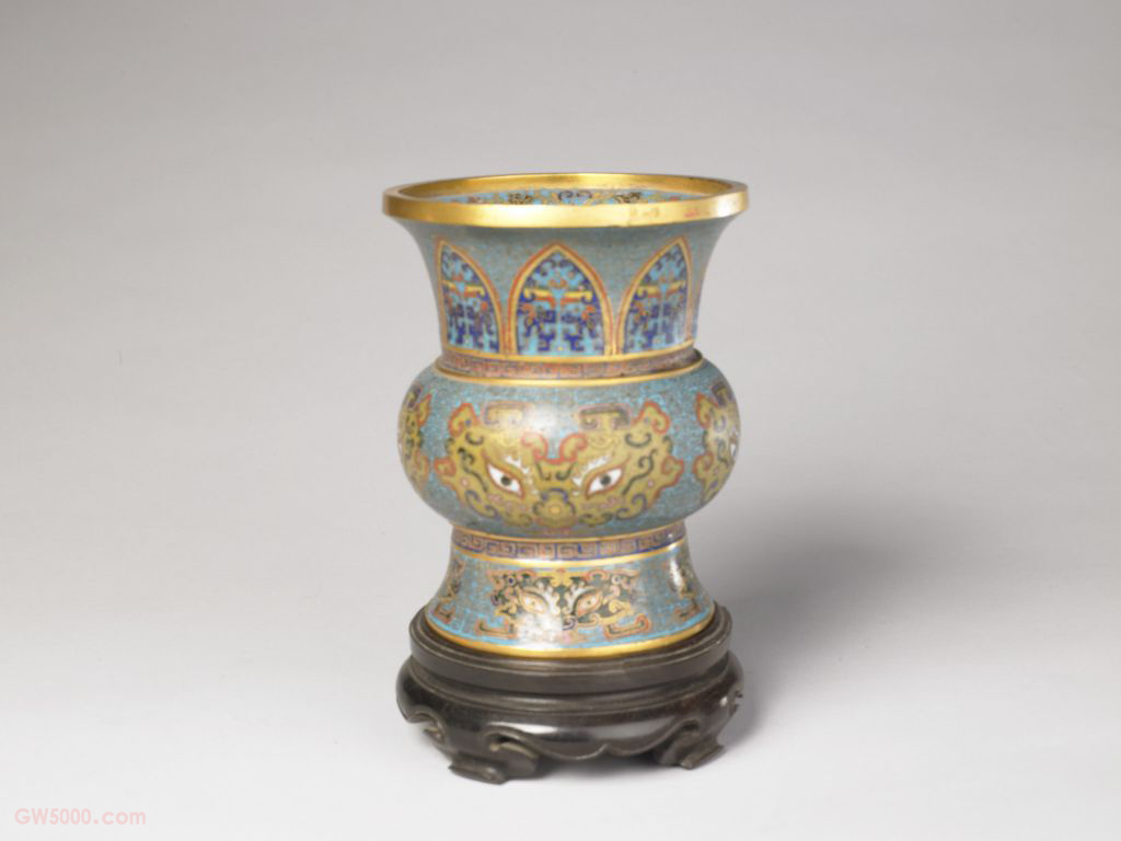 乾隆款掐丝珐琅兽面纹尊,清乾隆,高13.5厘米,口径11厘米。清宫旧藏。 尊圆形,撇口,鼓腹,高圈足。通体在浅蓝色珐琅地上饰掐丝回纹锦地。颈部饰蕉叶形开光,内有螭纹。腹、足四面均饰兽面纹。口内饰缠枝莲纹。外底双方框内镌阳文“乾隆年制”楷书款。 此尊造型仿古铜器,掐丝均匀细腻,填饰饱满,工艺精致,为清乾隆时期掐丝珐琅器皿中的精品。俗称“景泰蓝”。以红铜作胎,将很细的铜扁丝掐成花纹后用药焊于器表,再以随类附彩的方法将珐琅釉料填进丝间,经焙烧、打磨、镀金而成。 珐琅,又称“佛郎”“法蓝”“琺瑯”,是一外来语的音译词。珐琅的基本成分为石英、长石、硼砂和氟化物,与陶瓷釉、琉璃、玻璃(料)同属硅酸盐类物质。中国古代习惯将附着在陶或瓷胎表面的称“釉”;附着在建筑瓦件上的称“琉璃”;而附着在金属表面上的则称为“珐琅”。 金属胎珐琅器则依据在制作过程中具体加工工艺的不同,可分为掐丝珐琅器、錾胎珐琅器、画珐琅器和透明珐琅器等几个品种。兽面是古代人们想象中的怪兽的面部,将其刻画在器物上所形成的纹饰称兽面纹。宋代的学者把兽面纹称为饕餮纹。家具上常用的纹饰之一,由陶器和青铜器上的雷纹衍化而来,寓意吉利深长,苏州民间称之为“富贵不断头”。在家具上,回纹主要作为边饰,用于边框、牙条、足端或束腰等处。家具上大量采用回纹见于清代。锦原为丝织物的种类名,花纹精致古雅。漆器上所谓锦地,是指用漆填或描绘出华美的纹样作衬地,其上再饰各种图案。 我国传统装饰技法之一。即为使器物上的装饰变化多样或突出某一形象,往往在器物的某一部位勾勒出某一形状(如扇形、蕉叶形、菱形、心形、桃形、圆形等)的空间,其内饰以图纹。 螭,传说中的一种龙,又名螭虎龙。明式家具常用为装饰纹样。中国传统装饰花纹之一。所绘花朵系以植物的枝干或蔓藤作骨架,枝叶相互缠绕,构成四方连续或二方连续的图案,统一中寓变化。有缠枝莲、缠枝菊、缠枝牡丹和缠枝宝相花等多种纹样。 中国传统装饰花纹形式之一。其绘花朵上下周转,枝叶相互缠绕成图案形式,有缠枝莲、缠枝菊、缠枝牡丹等。以莲花为主题者,称缠枝莲。莲花是随佛教的传入而在中国的工艺品上流行开的。魏晋南北朝时佛教艺术在中国大为盛行,莲花便作为佛的象征而广泛出现在中国的工艺品上。南北朝时瓷器上的莲花瓣装饰十分普遍,成为这一时期瓷器装饰的标志性的纹样。此后,莲花就成为瓷器装饰中最普遍的纹样之一。 篆刻的一种方式,即把印文镌成凸状,在纸上钤盖时印文是红色,因而又称为朱文。