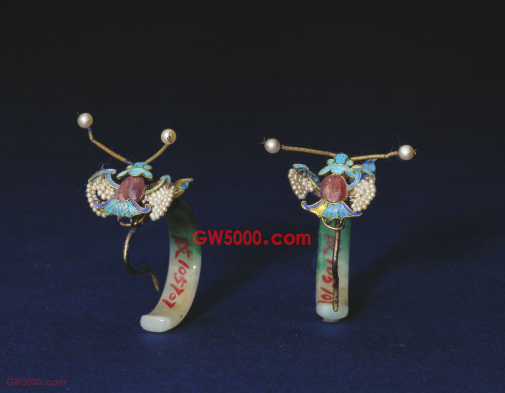 耳环翠玉质地,半圆形,一半为绿色,一半为白色,绿白分明。绿色一端部有铜镀金质蜜蜂及长弯针,蜜蜂腹嵌粉红色碧玺,翅膀由两组米珠组成,余皆点翠,两根长须之须端各有珍珠一粒。