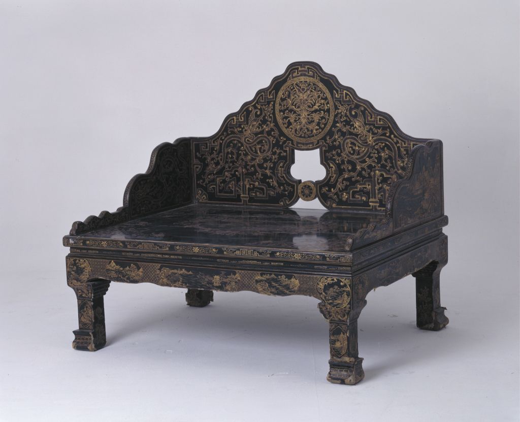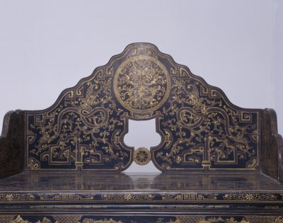 清中期,高121厘米,长137.5厘米,宽103厘米。 宝座木胎髹黑漆,通体描金花纹。三屏风式座围,山形靠背正中饰圆形开光,外描金龙纹。两侧及扶手饰卷草螭龙纹。靠背背面和扶手外面皆为山水楼阁纹。座面外沿和束腰饰回纹及各种花卉纹。牙条、四足皆雕回纹,足下有托泥,座前附脚踏。传统家具中一种体型宽大的坐具,亦称“御座”。明以后,随着皇权制度的强化,宝座成为帝王御用坐具的代名词,象征着帝王的权威。《明史》载,明神宗时,宦官冯保窃权,“帝御殿,保辄侍侧”。当时的吏部都给事中雒遵进言:“保一侍从之仆,乃敢立天子宝座,文武群工拜天子耶,抑拜见中官耶?”将宦官立于宝座之侧视为亵渎皇权的大不敬行为。 宝座大多摆放在宫廷正殿明间的中心或显要位置,单独陈设,极少成对。在宝座的背后还要放置一个较大的座屏,两边放置甪端、香筒、仙鹤、蜡钎等器物,格外尊贵、庄严。皇帝端坐在宝座之上,俯视群臣,“君临天下”,充分体现出帝王的权威,以达到“明制度,示等威”的目的。瓷器装饰手法之一。其工艺是以毛笔蘸调和好的金粉,在烧好的瓷器上描绘图案花纹,然后入炉经低温烘烧而成。描金创烧于北宋定窑,南宋人周密《志雅堂杂钞》记载:“金花定碗用大蒜汁调金描绘,然后再入窑烧,永不复脱。”用大蒜汁调和金粉是利用其天然的粘性。明清的景德镇御窑厂亦常用描金装饰颜色釉瓷器,如著名的宣德鲜红釉描金器、弘治黄釉描金器、乾隆窑变釉描金器等。 屏风是我国古代室内的主要陈设器物。其最早的功能为挡风和遮避用。据《三礼图》记载:“屏风之名出于汉世,故班固之书多言其物。”以后随着工艺的进步,屏风逐渐由原来的实用品演进为实用性和装饰性结合的工艺品,成为古人居室内具有观赏性的陈设家具。屏风在清代发展尤盛,无论是所用材料还是工艺技术都达到了历史最高水平。 亦称欹床。中国传统家具中的一种坐具,现已很少见。其形式犹如椅子的靠背,是一种无座腿甚至无座面的坐具。其背后安有可以撑放的活动支架,可根据使用者的要求调节靠背的角度。它多在床榻上或席地使用。明高濂《遵生八笺》中说:“靠背以杂木为框,中穿细藤,如镜架然。高可二尺,阔一尺八寸,下作机扃,以准高低,置之榻上,坐起靠背,偃仰适情,甚可人意。”宋、明绘画中也可见到此种坐具。 我国传统装饰技法之一。即为使器物上的装饰变化多样或突出某一形象,往往在器物的某一部位勾勒出某一形状(如扇形、蕉叶形、菱形、心形、桃形、圆形等)的空间,其内饰以图纹。 陶瓷器装饰纹样之一种。明、清两代是陶瓷器以龙纹为装饰的全盛时期,主要采用釉上、釉下彩绘方法,亦有印花、刻划等工艺。龙的体态有较多变化,常见有云龙、戏珠龙、海水龙、螭龙、行龙、立龙、正面龙、侧面龙、夔龙等。17、18世纪传入中国的一种装饰花纹。俗称西蕃莲,如果没有花朵,则称为卷草。束腰,明清家具部件名称。原是须弥座上枭与下枭之间的部分,在家具上指面框和牙条之间缩进的部。束腰是我国传统家具造型的典型式样之一。家具上常用的纹饰之一,由陶器和青铜器上的雷纹衍化而来,寓意吉利深长,苏州民间称之为“富贵不断头”。在家具上,回纹主要作为边饰,用于边框、牙条、足端或束腰等处。家具上大量采用回纹见于清代。 古建筑彩画绘画的一种题材。清代中期之前多画绿叶子花卉,清代晚期画黑叶子花卉。很多家具在立木与横木的支架交角处多运用形式不同的牙子来装饰。这种牙子中长而直的称为牙条。传统家具上承接腿足的部件。明清家具中有的腿足不直接着地,另有横木或木框在下承托,此木框即称为“托泥”。有的托泥之下还有小足,小足才是真正落地的部位。此部件多见于条案、几类等传统家具,以增稳重之感。
