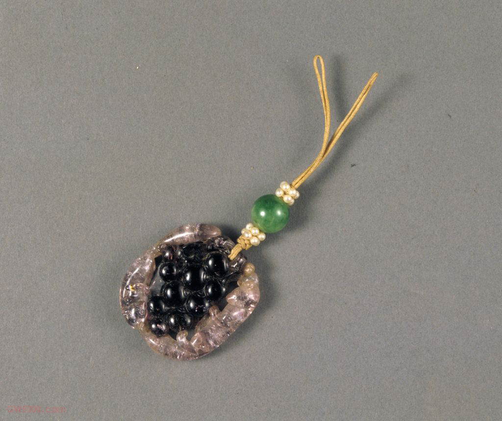 碧玺雕松鼠葡萄佩,清,长4.1厘米,宽3.7厘米,厚0.9厘米。 佩为碧玺质地,扁长方形,片状。两面透雕,外围为浅粉色,雕两只松鼠,长长的尾巴,首尾相接。中间部分为深紫色,雕大小葡萄珠。背面雕有葡萄叶及阴琢的叶脉。佩上部有穿孔,系丝绳、米珠两组及翠珠一粒。 此佩利用双色碧玺巧雕松鼠吃葡萄,构图巧妙,生动有趣。宝石名。据传源于波斯语“披及札基”的谐音,所以古时又称披耶西、碧霞玺、碧霞玭、碧霞希及碧洗等,即今日的“电气石”宝石。古籍记载碧玺产于缅甸,现我国新疆、内蒙古等地的伟晶岩中均产有各色碧玺,其中以新疆阿勒泰所产碧玺最为著名。 雕刻技法之一。一种是在浮雕的基础上镂空背景部分,有单面雕、双面雕之分。另一种介于圆雕和浮雕之间,常用于民间床、窗、梁、护板的雕刻中。