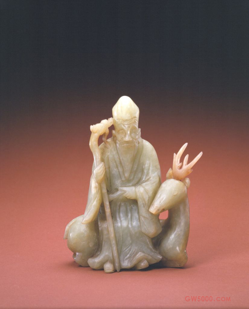 作品造型繁简相宜,老人头部的雕琢细腻而鹿则仅具外形,衣褶也只以直线及折线表示,仅有少量弧线。这类雕饰风格在明代玉器中多有运用。即老人星,人们常把其塑成头部长而隆起的老人形象,是中国传统文化中长寿的象征。