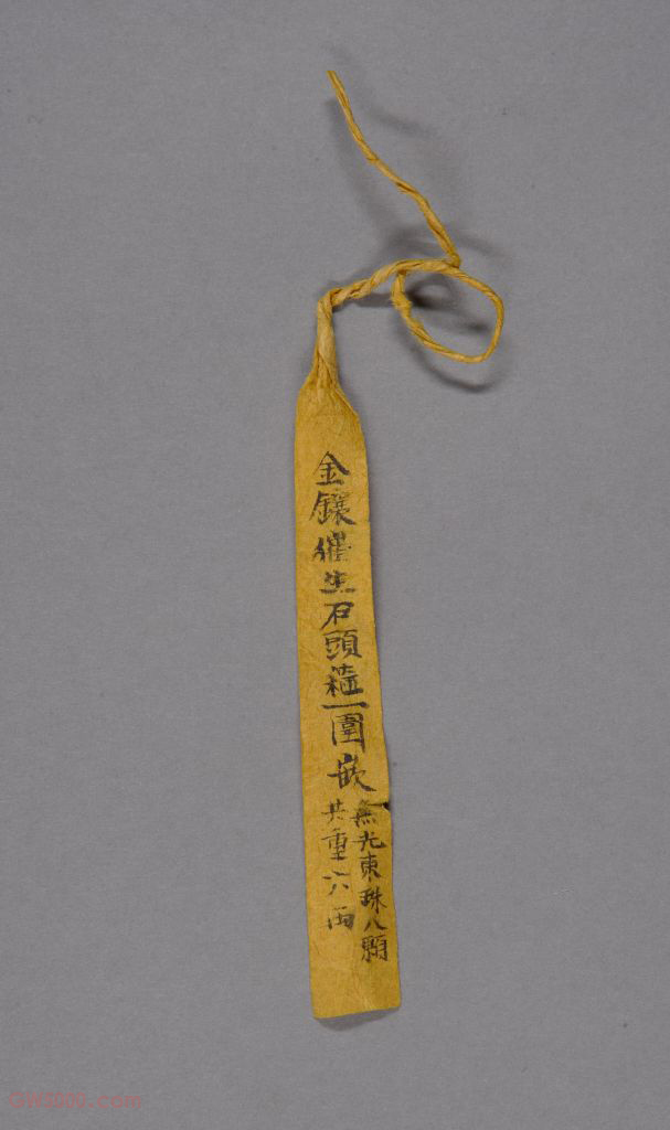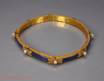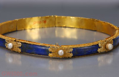 金镶青金石金约,清,外径21.50厘米,内径18.60厘米,最厚1.20厘米。清宫旧藏。 金约是清代后妃的头饰之一,在戴朝冠时需先戴金约,用以束发。金约由金箍和后部垂缀的串珠两部分组成,金箍的节数和串珠的行数多少,反映了后妃等级地位的高低。皇太后、皇后的金约为镂金云十三,串珠五行二就;皇贵妃、贵妃为镂金云十二,串珠三行三就;妃为镂金云十一,串珠三行三就;嫔为镂金云八,串珠三行三就。 此金约为清代嫔使用,串珠已缺失,仅余金箍。金箍由八节金托组成,金托上下两缘饰累丝云纹,每节中间嵌青金石。各节间用梅花形金铆钉相连,外有累丝金云,金云中间嵌东珠一颗。附黄条,其上墨书“金镶催生石头箍一围,嵌无光东珠八颗,共重六两”,催生石即青金石。清代后妃朝冠后部的垂珠形式之一,即垂珍珠5串,称五行;以青金石等玉石作为分节点,将珍珠分为上下两段,称二就,合称五行二就。这是清代后妃朝冠形制中最高等级的标志之一,仅皇后或皇太后可享用,皇后以下的皇贵妃或皇子福晋的朝冠则只能享用三行二就。 我国古代金工传统工艺之一,又名“花作”或“花纹”,为金属工艺中最精巧者。它是将金银拉成丝,然后将其编成辫股或各种网状组织,再焊接于器物之上,谓之累丝。立体的累丝作品制作最难,须事先经“堆灰”的手续。所谓“堆灰”,即把炭研成细末,用白芨草泡制的粘液调和作为塑料,塑成人物或走兽等所要制作的物象,然后再在上面进行累丝,用焊药焊连,之后置于火中把里面的炭模烧毁,即成立体中空剔透玲珑的精美艺术品。 清朝的冠服制度中特别讲究用东珠。东珠是珍珠的一种,古人依产地的不同把珍珠划分为南北两大系,而清朝则把产生于东北地区的北珠称为“东珠”。东珠是湖珠,色白而透明度较差,但因它产量极少,所以成为贵重之物。清朝的冠服制度只有皇帝、皇太后、皇后佩戴东珠朝珠,帽顶等所嵌东珠的数量也按亲王,郡王,贝勒等级有严格的限制。