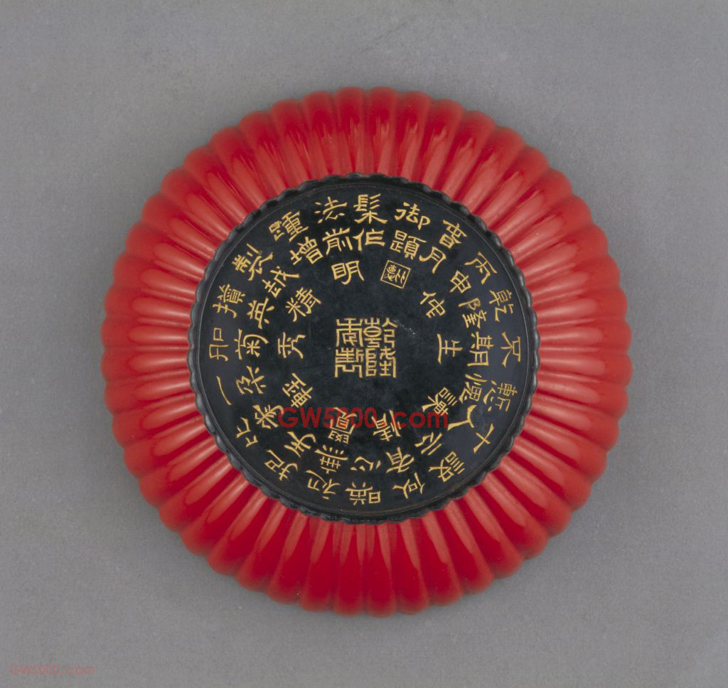 脱胎朱漆菊瓣式盒,清乾隆,口径15.5厘米,高9厘米。 盒呈菊花瓣形,通体髹朱漆,外底髹黑漆,刀刻填金隶书乾隆皇帝御制的《咏朱漆菊花盒》诗一首:“髹作法前明,踵增制越精。攒英如菊秀,一朵比花轻。把手初无觉,映心似有情。设云十人谏,惭愧不期生。”末署“乾隆丙申仲春月御题”及“比德”印章款。底中部有“乾隆年制”篆书款。“丙申”是乾隆四十一年,即西历1776年。 此盒壁厚约一毫米,胎薄体轻,系采用夹紵胎技法制成。夹紵胎与木胎不同,是用漆或漆灰将若干层布糊裱在一起,又称“脱胎”,具有坚实轻巧的特点。乾隆皇帝在上引诗中赞美它“攒英如菊秀,一朵比花轻。把手初无觉,映心似有情”;在另一首赞美朱漆菊瓣盘的《咏仿永乐朱漆菊花盘》诗中称:“吴下髹工巧莫比,仿为或比旧还过。脱胎那用木和锡,成器奚劳琢与磨!”《髹饰录解说》中谈到,朱漆色泽因髹饰季节的不同而有所区别:春夏两季做的朱漆鲜艳明亮,秋季做的颜色较深。银硃含量的多少,也会对颜色的明暗产生影响。由是观之,这件朱漆盒的颜色较亮,可能是在春季制作的,或者与银硃含量较多有关。 根据造办处档案记载,乾隆四十二年以后曾多次仿照脱胎朱漆菊瓣式盘的做法制作菊瓣式盒,全部由苏州织造承办,做好之后,或者拿到懋勤殿刻御制诗《咏朱漆菊花盒》,或者直接送到淳化轩、宁寿宫、画舫斋、镜清斋、乐寿堂等重要宫殿,以便皇帝能够随时把玩。佛教中指一切有感情、有意识的生物为“有情”,是“非情”(指草木、山河、大地等)的对称。梵文音译为萨多婆、萨埵,旧译为“众生”,即生存者之意。官名。明清江南织造官署的主官。掌理织作“上用”和“官用”绸缎布匹事务。明代由提督太监出任。清代选派内务府司官担任,称织造监督。驻江宁(今南京)、苏州、杭州等三处,每处一人。统属于内务府总管大臣,由缎库郎中具体负责考察评定。织造在驻地以钦差官身份出现,与地方最高长官平行;并且充当“圣上”的耳目,密报所在地方官声民情,往往由皇帝亲信出任。 位于长春园中宫中路偏北,约建于乾隆三十三年至三十五年(1768--1770年)间,毁于1860年英法联军侵华火烧圆明园三园之际。现遗址柱础少有残留,一片荒芜。国家图书馆藏有一张清代样式雷淳化轩平面图,可反映其柱网结构和内檐装修。乾隆皇帝在《癸卯新正乐寿堂》诗注中说:“长春园之淳化轩先已落成,原为归政后园亭憩息之所。宁寿宫之乐寿堂乃仿其规制为之。”