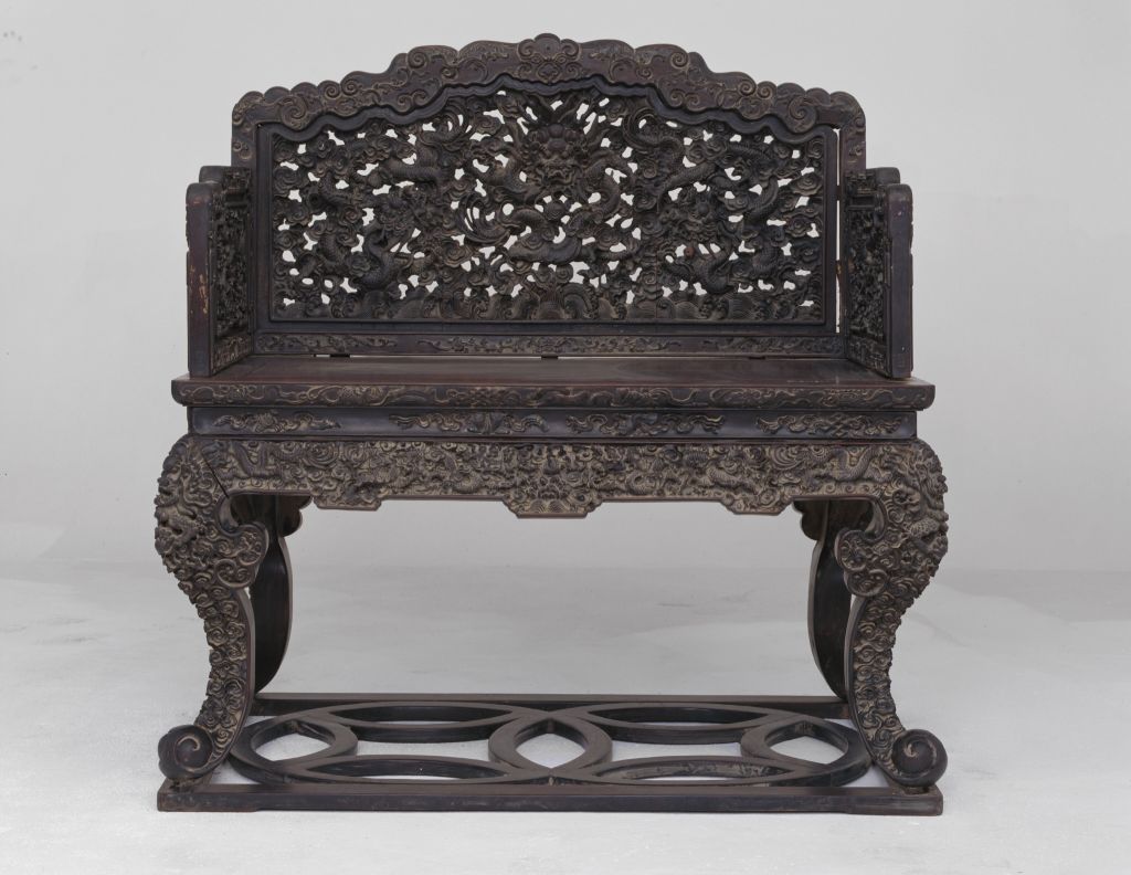 清中期,高132厘米,长126厘米,宽75厘米。 宝座红木制,硬板座面,侧沿浮雕八宝纹,面下打洼束腰,浮雕杂宝纹。鼓腿彭牙三弯腿,外翻云纹马蹄。牙条下垂洼堂肚,与腿足一起满雕云龙纹。足下带框式托泥,作双钱纹式透棂。面上三面座围,正中稍高,两侧递减,攒框镶心透雕海水江崖及云龙纹,搭脑镂出曲边,浮雕卷草纹。 此器形体高大,气势雄伟,雕工精细,只有不惜剖解大料,才能显现出这种格高神秀的艺术韵味。传统家具中一种体型宽大的坐具,亦称“御座”。明以后,随着皇权制度的强化,宝座成为帝王御用坐具的代名词,象征着帝王的权威。《明史》载,明神宗时,宦官冯保窃权,“帝御殿,保辄侍侧”。当时的吏部都给事中雒遵进言:“保一侍从之仆,乃敢立天子宝座,文武群工拜天子耶,抑拜见中官耶?”将宦官立于宝座之侧视为亵渎皇权的大不敬行为。 宝座大多摆放在宫廷正殿明间的中心或显要位置,单独陈设,极少成对。在宝座的背后还要放置一个较大的座屏,两边放置甪端、香筒、仙鹤、蜡钎等器物,格外尊贵、庄严。皇帝端坐在宝座之上,俯视群臣,“君临天下”,充分体现出帝王的权威,以达到“明制度,示等威”的目的。即酸枝木,泛指豆科黄檀,属酸枝木类植物。有黑酸枝、红酸枝、白酸枝三种。家具中床面或凳面之板心用木板镶成或席面下衬木板均称硬板。桌面四边垂直的部分称侧沿。在平面上雕出凸起的纹饰或物象的一种雕塑。按凸起高度的不同,可分为高浮雕、深浮雕、浅浮雕等,也有几种雕刻技法结合使用的形式,多见于高精繁杂的雕刻作品。 佛前供器,藏文称之为“八吉祥相”。由法轮、法螺、宝伞、白盖、莲花、宝罐、金鱼、盘肠八件组成。每件供器含义不同:轮代表佛说大法圆转,万劫不息;螺代表菩萨果妙音吉祥;伞代表张弛自如,曲覆众生;盖代表遍覆三千,净一切乐;花代表出五浊世无所染;罐代表福智圆满,具完无漏;鱼代表坚固活泼,能解坏劫;肠代表回环贯彻,一切通明。因为八宝寓意吉祥,所以成为我国传统工艺中的主要纹饰。 1. 家具工艺术语。家具线脚起阳线而又在其正中做出凹面的称作“打洼”。两道并列称“双打洼”,一道的称“单打洼”。<BR> 2. 一种玉器制作的工艺手法,一般采用打磨减地方式做出凹沟似的造型。 束腰,明清家具部件名称。原是须弥座上枭与下枭之间的部分,在家具上指面框和牙条之间缩进的部。束腰是我国传统家具造型的典型式样之一。 由古代一些常用的吉祥物所组成的纹饰。通常有珠、钱、磬、祥云、方胜、犀角杯、书、画、红叶、艾叶、蕉叶、鼎、灵芝、元宝、锭等。 明式家具腿足最常见的形式之一。其腿部从束腰处向外膨出,然后内收,至下端又向外兜转,形成三道弯,以形取名,故名三弯腿。很多家具在立木与横木的支架交角处多运用形式不同的牙子来装饰。这种牙子中长而直的称为牙条。清式家具的装饰手法之一,牙条正中下垂的曲边装饰线角称为“洼堂肚”。陶瓷器装饰纹样之一种。明、清两代是陶瓷器以龙纹为装饰的全盛时期,主要采用釉上、釉下彩绘方法,亦有印花、刻划等工艺。龙的体态有较多变化,常见有云龙、戏珠龙、海水龙、螭龙、行龙、立龙、正面龙、侧面龙、夔龙等。传统家具上承接腿足的部件。明清家具中有的腿足不直接着地,另有横木或木框在下承托,此木框即称为“托泥”。有的托泥之下还有小足,小足才是真正落地的部位。此部件多见于条案、几类等传统家具,以增稳重之感。中国古代家具上用攒边方法做成的框称为攒框。家具板面通用的一种传统作法。由大边、抹头、穿带和面心组成,面心四边作出榫舌,大边和抹头作出榫槽,将面心镶在榫槽内,木工术语称之为“攒框镶心”。 雕刻技法之一。一种是在浮雕的基础上镂空背景部分,有单面雕、双面雕之分。另一种介于圆雕和浮雕之间,常用于民间床、窗、梁、护板的雕刻中。 装在椅背或衣架之上用于连接立柱和背板的构件。椅背搭脑一般正中稍高并略向后卷,以便人们休息时将头搭靠其上,故名。 瓷器纹饰,又称卷叶纹或卷枝纹,宜于作各种器物的辅助纹饰。 17、18世纪传入中国的一种装饰花纹。俗称西蕃莲,如果没有花朵,则称为卷草。雕镂之工。