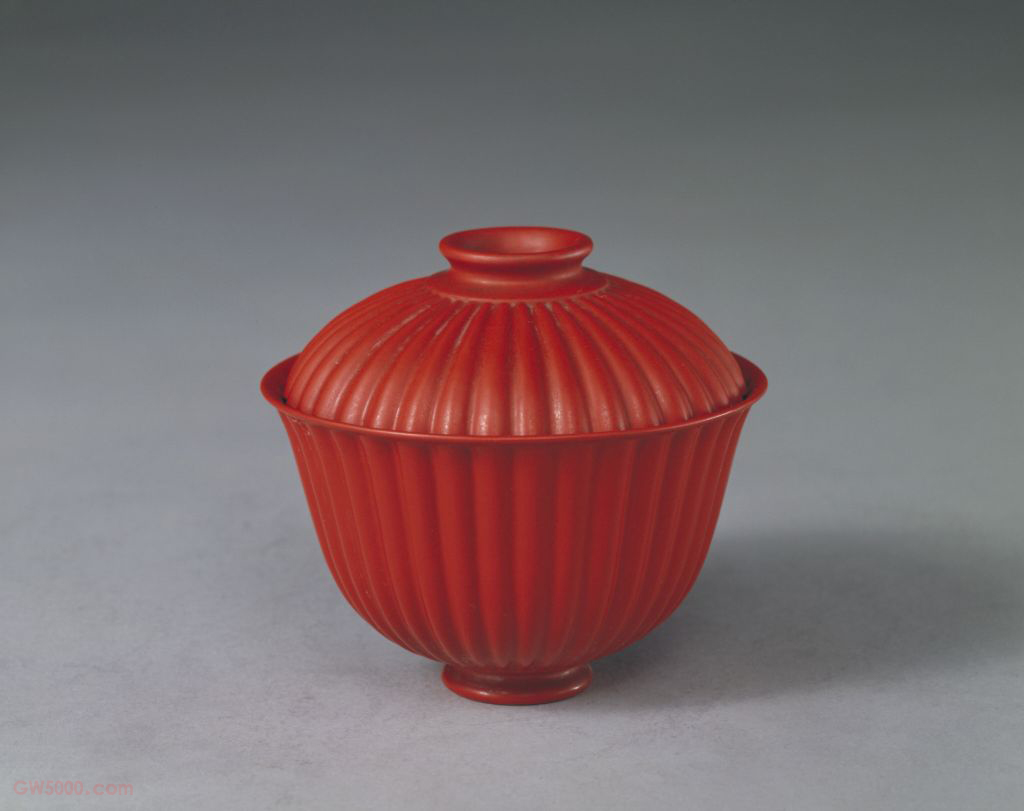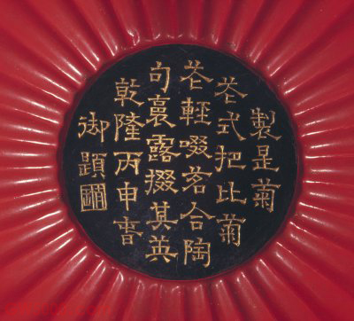 脱胎朱漆菊瓣式盖碗,清乾隆,口径10.8厘米,通高9.8厘米。 碗呈菊瓣形,敞口,略外撇,弧腹,平底,矮圈足。通体髹朱漆,盖内及碗心髹黑漆后,刀刻填金隶书乾隆御制诗《题朱漆菊花茶杯》:“制是菊花式,把比菊花轻。啜茗合陶句,裛露掇其英。” 末署“乾隆丙申春御题”及“太璞”印章款。“丙申”是乾隆四十一年(1776年)。盖钮及外底均有刀刻填金“乾隆年制”篆书款。 根据档案记载,乾隆四十年二月,皇帝命令苏州织造按照发去的青白玉撇口碗样款大小,照先做过的朱漆菊瓣盘做法一样成做朱漆菊瓣盖钟一对,同年十一月做得送京后,交懋勤殿刻“乾隆年制”方款。次年《题朱漆菊花茶杯》写成以后,再传做菊瓣式钟、碗则要求內底和盖里务必刻诗,诗堂圆光做黑漆地刻字填金。官名。明清江南织造官署的主官。掌理织作“上用”和“官用”绸缎布匹事务。明代由提督太监出任。清代选派内务府司官担任,称织造监督。驻江宁(今南京)、苏州、杭州等三处,每处一人。统属于内务府总管大臣,由缎库郎中具体负责考察评定。织造在驻地以钦差官身份出现,与地方最高长官平行;并且充当“圣上”的耳目,密报所在地方官声民情,往往由皇帝亲信出任。亦称圆鼓子,位于每块天花方光以里的正中之圆形,天花的主题纹样绘于其里。