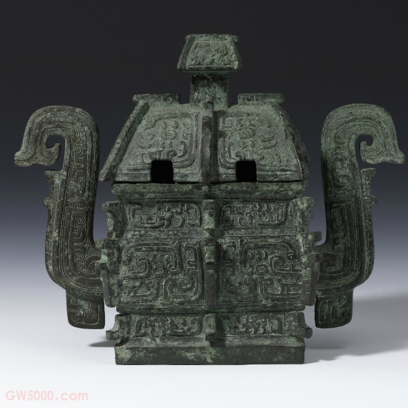 彝为盛酒器。西周方彝大都曲壁,但多无耳,也少有中壁。此方彝造型奇特,小巧精美,极具特色,是不可多得的珍品。