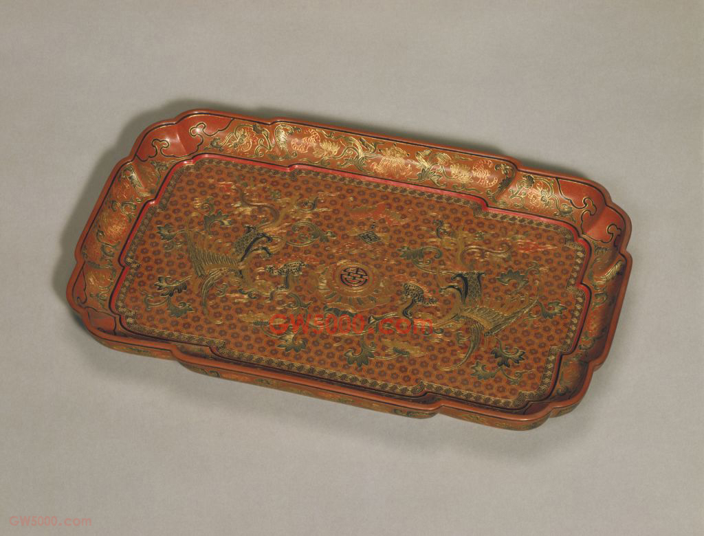 戗金彩漆万福凤盘,清乾隆,高3.3厘米,口径29.2×19厘米。 盘长方形委角,浅腹微鼓,平底,矮圈足。通体采用戗金彩漆技法装饰花纹。内壁如意形开光绘折枝花卉纹,开光外装饰填漆卍字锦地。外壁绘素地暗八仙纹。内底以填漆龟背锦纹为地,中部上方装饰蝙蝠衔卍字结,下方有一朵盛开的牡丹,其花蕊被刻划成一个团寿字。牡丹花左右两边的枝蔓上各有一只翩翩飞舞的凤凰。外底髹红漆,近顶部有“大清乾隆年制”横行楷书款,其下有“万福凤盘”双排楷书器名款。器名款用以描述器物的形状及花纹,仅见于乾隆皇帝御用的部分雕漆器、戗金彩漆器和填漆器。此件漆盘的花纹线条流畅,锦地细密规整,打磨光滑,工艺技术严谨。漆色以柔和的暗红和黄褐搭配闪耀夺目的金黄,给观赏者带来雍容华贵的视觉效果。可以视作乾隆朝内务府造办处繁密、纤细、华丽的制器风格的杰出代表。髹漆工艺技法名称,之一。即在器物表面先按照设计的图案阴刻出花纹,然后再在阴纹内打金胶,上金粉,使之成为金色的花纹,常见于髹漆工艺。