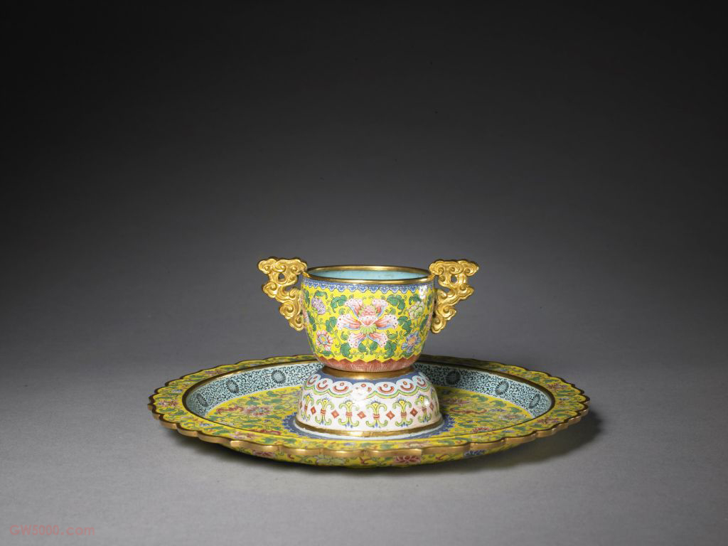 金胎画珐琅杯盘,清乾隆,通高7.5 厘米,杯口径5.5 厘米,通宽9.3 厘米,盘径18.5厘米。金属胎珐琅工艺之一。作法是先在红铜胎上涂白珐琅,入窑烧结后,在其平滑的表面以各色珐琅料及金绘画图案,再经焙烧而成。这种工艺晚于錾胎和掐丝珐琅,是清康熙年间(1662—1722年)在欧洲画珐琅工艺的影响下烧制成功的。 珐琅,又称“佛郎”“法蓝”“琺瑯”,是一外来语的音译词。珐琅的基本成分为石英、长石、硼砂和氟化物,与陶瓷釉、琉璃、玻璃(料)同属硅酸盐类物质。中国古代习惯将附着在陶或瓷胎表面的称“釉”;附着在建筑瓦件上的称“琉璃”;而附着在金属表面上的则称为“珐琅”。 金属胎珐琅器则依据在制作过程中具体加工工艺的不同,可分为掐丝珐琅器、錾胎珐琅器、画珐琅器和透明珐琅器等几个品种。