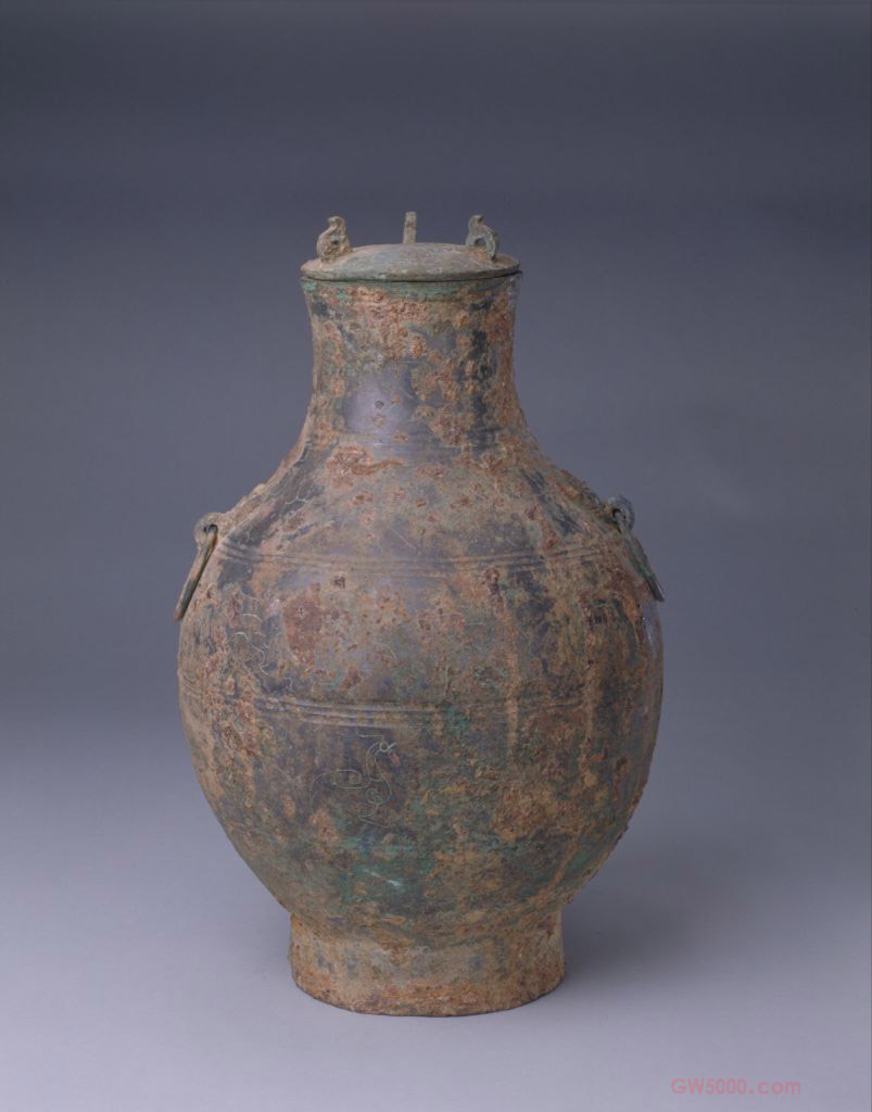 这是一件典型的秦式壶,圆体,圈足,肩部饰二兽首衔环。有盖,盖上三钮,中央饰涡纹。器颈、肩、腹部浅雕鸟纹四周,并以弦纹作间隔。