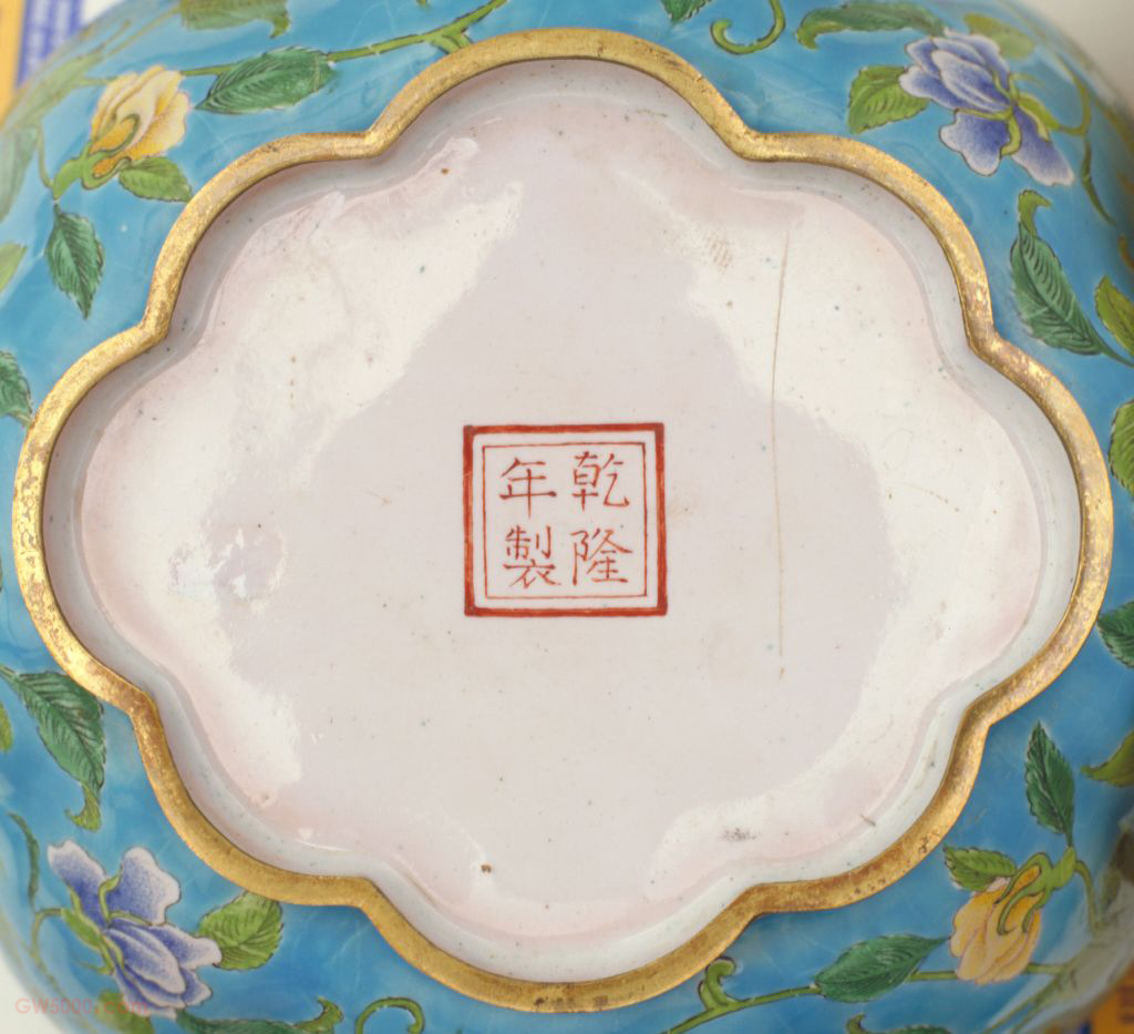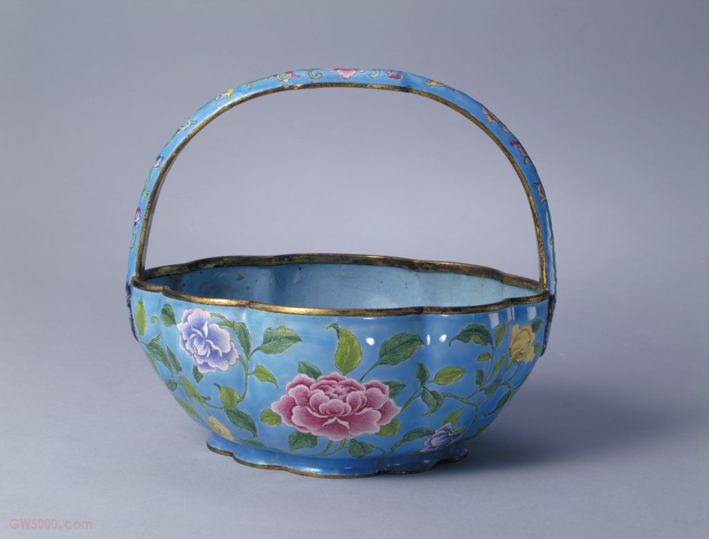乾隆款画珐琅蔷薇花纹花瓣式花篮,清乾隆,高15.3厘米,口径10×15.2厘米,底径10.3×9.3厘米。 花篮花瓣式,鼓腹,平底,圈足。通体施蓝色珐琅釉为地,腹部装饰粉色、藕荷色及黄色的蔷薇花花纹一周,并带有细枝绿叶。底施白釉,中部红色双方框内有“乾隆年制”楷书款。 花篮既有陈设欣赏价值又有盛装物品的实用价值,是宫中女眷多用之器,而画珐琅工艺精巧隽秀,是制作花篮的最佳选择。从流传实物看,花篮装饰大同小异,说明装饰花篮已程式化。