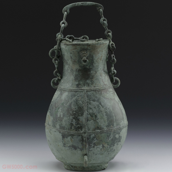 现在所知最早的壶是商代中期的,直至汉代仍较为流行。基本形制为圆形或扁圆形,也有方形或椭方形,有盖,肩上有环,套接提梁或直接用绳索作提梁。西周中、晚期,壶有大型化倾向。由于壶体高大,已不可能设提梁来提拎,因此多在颈部置一对兽首衔环耳。