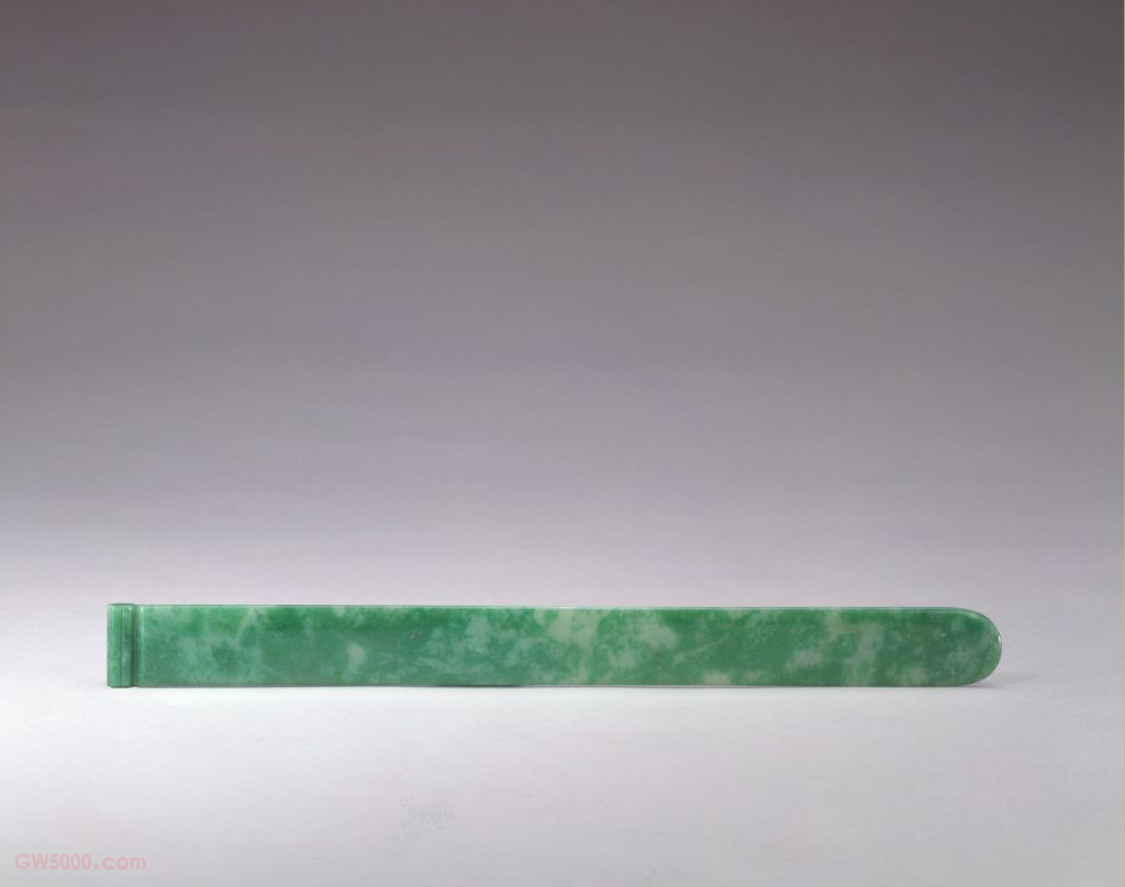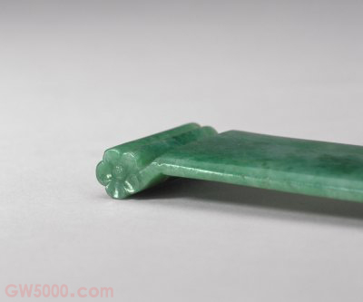 翠扁方,清,长34.4厘米,宽3.1厘米。 扁方翠质,体细长,一端呈舌形,一端反卷并将其两头雕作梅花式。整体光素,略有白斑,但不掩其翠色深碧艳丽之美。 扁方是满族妇女梳“两把头”最主要的工具,相当于汉人妇女发髻上的扁簪。它不仅具有单纯的装饰作用,还能控制发髻不至散落。满族妇女梳“两把头”,最初是把真发分成两把,依靠扁方固定。到了晚清两把头改成以青缎制作,安在头顶上,与真发梳成的头座连接也依靠扁方。制作扁方的材料有玉、翡翠、玳瑁,还有的为金胎镶玉、镶翠或镶嵌其他珠宝,或金凿花、银镀金等。清代贵族妇女插发用的头饰。宫廷中所用扁方多为玉制,也有珊瑚、翡翠、金镶玉和玉嵌宝石等制品。 满族,中国北方少数民族,源于女真。1616年努尔哈赤统一女真各部建立“后金”政权。1635年皇太极改女真族为满洲(今称满族)。<br /> 龟类动物,产于海洋,体长三尺余。形似龟而嘴尖,前足长,背有主甲十三片,重叠如覆瓦,淡黑而微黄有黑斑,胸甲黄黑,性强暴。其甲熟之甚柔,可制工艺品。以其所制笔杆极为珍稀。 我国古代金工传统工艺之一。铸造铜器时,在需镶嵌部位表面铸成线槽,将松石、红铜片或金银丝、片嵌入凹槽,再打磨平滑。镶嵌工艺始于二里头文化时期,在春秋时期较盛行。