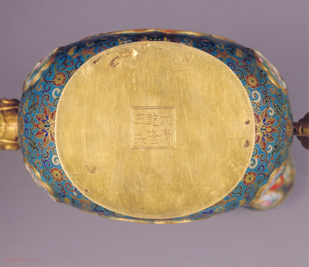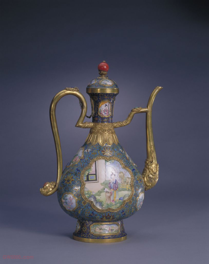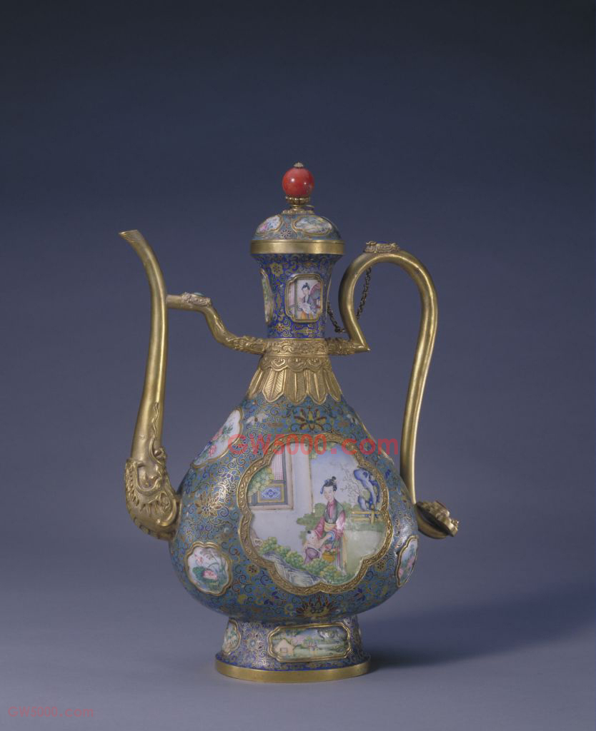 乾隆款金胎掐丝珐琅嵌画珐琅执壶,清,通高39厘米,最宽28厘米,口径7.3厘米,足径12.3×11.7厘米。 壶身通体以掐丝珐琅缠枝莲纹为地,盖、颈、肩、腹、足等处有对称布置但大小、形状各异的画珐琅开光,开光内饰人物、山水、花卉、庭院等图案。壶颈錾饰花卉、如意云头、蕉叶纹各一周。流、执柄、横梁与壶体焊接之一端皆装饰张口龙首。壶底双栏方框内錾刻楷书“大清乾隆年制”款。 珐琅器以铜胎居多,金胎少见。此壶造型沿用明代金执壶样式,开光内图案虽作中国人物、景致,却杂糅了欧洲绘画的表现技法,是一件中西合璧的皇家艺术珍品。