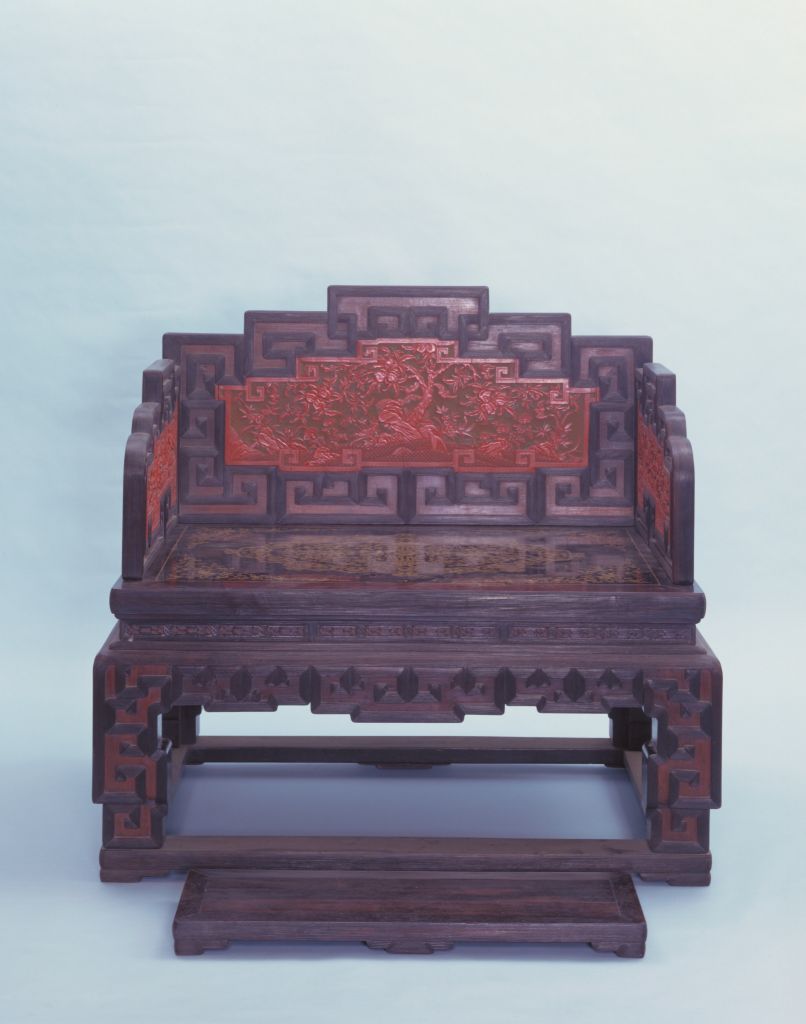 清中期,高103厘米,长104厘米,宽84.5厘米。 宝座紫檀木质,三屏风式座围,边框雕回纹,并在回纹之上满雕细线。边框中心嵌剔红板心,雕刻灵芝、水仙、竹子及寿桃,寓“灵仙祝寿”之意。座面髹漆并描金花卉,雕花束腰下承托腮。牙子及四足亦雕回纹,并在回纹之上满雕细线。足下有托泥,座前有脚踏。匠师以红漆与紫檀的色彩差别形成对比,使图案生动活泼,此宝座为清代中期家具精品。传统家具中一种体型宽大的坐具,亦称“御座”。明以后,随着皇权制度的强化,宝座成为帝王御用坐具的代名词,象征着帝王的权威。《明史》载,明神宗时,宦官冯保窃权,“帝御殿,保辄侍侧”。当时的吏部都给事中雒遵进言:“保一侍从之仆,乃敢立天子宝座,文武群工拜天子耶,抑拜见中官耶?”将宦官立于宝座之侧视为亵渎皇权的大不敬行为。 宝座大多摆放在宫廷正殿明间的中心或显要位置,单独陈设,极少成对。在宝座的背后还要放置一个较大的座屏,两边放置甪端、香筒、仙鹤、蜡钎等器物,格外尊贵、庄严。皇帝端坐在宝座之上,俯视群臣,“君临天下”,充分体现出帝王的权威,以达到“明制度,示等威”的目的。紫檀木是世界上最名贵的木材之一,主要产于南北回归线之间的热带、亚热带地区,我国广东、云南等地有少量出产。其木质坚硬,体重,入水即沉,没有疤痕,呈紫黑色。紫檀木生长缓慢,非数百年不能成材,故极珍贵。紫檀木的纹理纤细浮动,变化无穷,其色调深沉,显得稳重、大方、美观。《博物要览》称:“新者色红,旧者色紫,有蟹爪纹,新者以水浸之,可染物。”我国古代使用紫檀木制作器物历史悠久,东汉末年已见于记载,唐代宫廷中亦有使用紫檀木的记载。至明代,紫檀木更是受到皇家的宠爱。清代,紫檀木大量进入宫廷中,为内务府造办处用于制作清宫家具及文玩之器的必备材料,同时一些富商大贾之家也多使用名贵的紫檀木制造家具及生活用品。 屏风是我国古代室内的主要陈设器物。其最早的功能为挡风和遮避用。据《三礼图》记载:“屏风之名出于汉世,故班固之书多言其物。”以后随着工艺的进步,屏风逐渐由原来的实用品演进为实用性和装饰性结合的工艺品,成为古人居室内具有观赏性的陈设家具。屏风在清代发展尤盛,无论是所用材料还是工艺技术都达到了历史最高水平。 家具上常用的纹饰之一,由陶器和青铜器上的雷纹衍化而来,寓意吉利深长,苏州民间称之为“富贵不断头”。在家具上,回纹主要作为边饰,用于边框、牙条、足端或束腰等处。家具上大量采用回纹见于清代。雕漆品种之一,又名“雕红漆”或“红雕漆”。此技法成熟于宋元时期,发展于明清两代。明黄成《髹饰录·坤集·雕镂第十·剔红》中写道:“剔红,即雕红漆也。……宋元之制,藏锋清楚,隐起圆滑,纤细精致。”其法常以木灰、金属为胎,在胎骨上层层髹红漆,少则八九十层,多达一二百层,至相当的厚度,待半干时描上画稿,然后再雕刻花纹。一般以锦纹为地,花纹隐起,华美富丽。根据漆色的不同,有剔红、剔黄、剔绿、剔黑、剔彩、剔犀之分,其中以剔红器最多见。 蕈的一种。食用灵芝,有强筋骨、益精气的滋补作用。灵芝在中国古代民间信仰中具有吉祥长寿的寓意。灵芝的出现,预兆着国泰民安,世事昌达,所谓“圣人休祥,有五色神芝含秀而吐荣”(《神农本草》)。《瑞应图》也称:“芝英者,王者德仁而生。”灵芝图案多出现于各种材质的古代艺术品和建筑彩画中。瓷器装饰手法之一。其工艺是以毛笔蘸调和好的金粉,在烧好的瓷器上描绘图案花纹,然后入炉经低温烘烧而成。描金创烧于北宋定窑,南宋人周密《志雅堂杂钞》记载:“金花定碗用大蒜汁调金描绘,然后再入窑烧,永不复脱。”用大蒜汁调和金粉是利用其天然的粘性。明清的景德镇御窑厂亦常用描金装饰颜色釉瓷器,如著名的宣德鲜红釉描金器、弘治黄釉描金器、乾隆窑变釉描金器等。 古建筑彩画绘画的一种题材。清代中期之前多画绿叶子花卉,清代晚期画黑叶子花卉。束腰,明清家具部件名称。原是须弥座上枭与下枭之间的部分,在家具上指面框和牙条之间缩进的部。束腰是我国传统家具造型的典型式样之一。束腰与牙条之间的托层。有些束腰家具,束腰与牙条不衔接或衔接甚少,不能起到支撑作用,这时在两者之间加一木条过渡,使结构更加合理。一般指设置在桌案的面框或束腰下、连接于两腿之间的部件。设于其它部位的则常称牙条。传统家具上承接腿足的部件。明清家具中有的腿足不直接着地,另有横木或木框在下承托,此木框即称为“托泥”。有的托泥之下还有小足,小足才是真正落地的部位。此部件多见于条案、几类等传统家具,以增稳重之感。