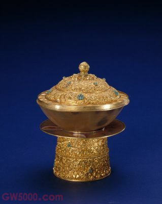 金錾花高足托盖玛瑙碗,清乾隆,通高18 厘米,碗口径14 厘米,托径13.4 厘米,足径9厘米。我国古代金工传统工艺之一。用小锤敲击各种大小不同的金属錾子,在金属表面留下錾痕,形成各种不同的纹理,使单一的金属表面产生多层次的立体装饰效果。此种工艺始于春秋晚期,盛行于战国,至今依然为匠师们沿用。