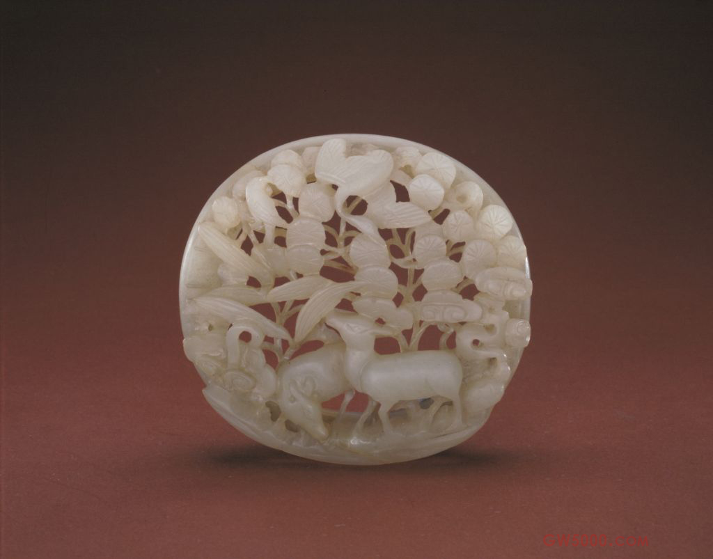 带饰青白色玉质。椭圆形,可分为上下两层,下层为圆环,上层镂雕图案。图案又可分为两层,下层为镂雕带状枝条,上层雕山石,并杂生灵芝、松、竹。松、竹下有雌雄二鹿,雄鹿昂首,雌鹿俯颈,雄鹿身后有一龟,口中吐云,一鹤一雀立于松竹之上。