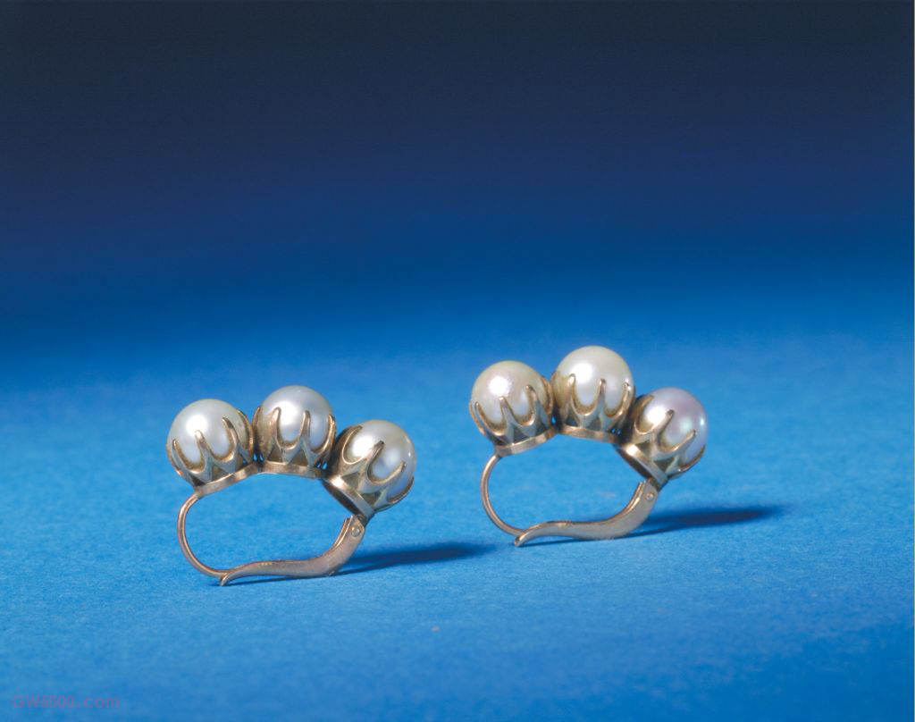 金镶东珠耳环,清,一对,长2.3厘米。 耳环为金托,镶三颗东珠,珠质光洁润泽,颗颗饱满。 此耳环式样简约大方,是清宫皇后所用之饰物。 清廷将产在满族龙兴之地——东北松花江流域的珍珠称为“东珠”,视之为珠宝饰物中品级最高者。凡是表面光泽呈半透明状、质地结实凝重、形状圆浑且颗粒较大有异彩者均被视为上品。 中国自汉代就有妇女戴耳环的记载,多用金、玉、珠、宝石等珍贵材料制作。清代后妃戴耳环有身份等级之别,穿朝服时,皇后所戴耳环各镶三颗东珠,妃嫔所戴嵌一对珍珠,平时随意。清朝的冠服制度中特别讲究用东珠。东珠是珍珠的一种,古人依产地的不同把珍珠划分为南北两大系,而清朝则把产生于东北地区的北珠称为“东珠”。东珠是湖珠,色白而透明度较差,但因它产量极少,所以成为贵重之物。清朝的冠服制度只有皇帝、皇太后、皇后佩戴东珠朝珠,帽顶等所嵌东珠的数量也按亲王,郡王,贝勒等级有严格的限制。 满族,中国北方少数民族,源于女真。1616年努尔哈赤统一女真各部建立“后金”政权。1635年皇太极改女真族为满洲(今称满族)。<br /> 指松花江石,本名“乌拉玉”,又称“松花玉”,出自东北松花江畔。因其产于清朝始祖的发祥地,故清圣祖康熙选用此种石料为宫廷御用砚材,并撰《制砚说》以志此事。此后,制作松花江砚遂成为清代宫廷的定制。康熙、雍正、乾隆三朝,松花江砚制作数量较多,至嘉庆、道光朝以后则停止采伐松花江石。