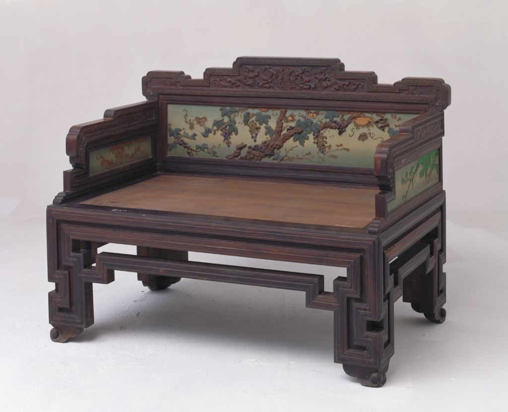 清中期,高99厘米,长127厘米,宽78厘米。 宝座紫檀木制,靠背、扶手做成三屏风式,上加搭脑,形似屏帽,回纹曲边,并浮雕海水云龙纹。靠背心及两扶手内外髹天蓝色漆地,以玉石等百宝嵌作古树、葡萄等纹。座面藤心,面沿及腿、罗锅枨均以混面双边线组成回纹,足下饰龟脚。此宝座造型新颖、别致,典雅脱俗。传统家具中一种体型宽大的坐具,亦称“御座”。明以后,随着皇权制度的强化,宝座成为帝王御用坐具的代名词,象征着帝王的权威。《明史》载,明神宗时,宦官冯保窃权,“帝御殿,保辄侍侧”。当时的吏部都给事中雒遵进言:“保一侍从之仆,乃敢立天子宝座,文武群工拜天子耶,抑拜见中官耶?”将宦官立于宝座之侧视为亵渎皇权的大不敬行为。 宝座大多摆放在宫廷正殿明间的中心或显要位置,单独陈设,极少成对。在宝座的背后还要放置一个较大的座屏,两边放置甪端、香筒、仙鹤、蜡钎等器物,格外尊贵、庄严。皇帝端坐在宝座之上,俯视群臣,“君临天下”,充分体现出帝王的权威,以达到“明制度,示等威”的目的。紫檀木是世界上最名贵的木材之一,主要产于南北回归线之间的热带、亚热带地区,我国广东、云南等地有少量出产。其木质坚硬,体重,入水即沉,没有疤痕,呈紫黑色。紫檀木生长缓慢,非数百年不能成材,故极珍贵。紫檀木的纹理纤细浮动,变化无穷,其色调深沉,显得稳重、大方、美观。《博物要览》称:“新者色红,旧者色紫,有蟹爪纹,新者以水浸之,可染物。”我国古代使用紫檀木制作器物历史悠久,东汉末年已见于记载,唐代宫廷中亦有使用紫檀木的记载。至明代,紫檀木更是受到皇家的宠爱。清代,紫檀木大量进入宫廷中,为内务府造办处用于制作清宫家具及文玩之器的必备材料,同时一些富商大贾之家也多使用名贵的紫檀木制造家具及生活用品。 亦称欹床。中国传统家具中的一种坐具,现已很少见。其形式犹如椅子的靠背,是一种无座腿甚至无座面的坐具。其背后安有可以撑放的活动支架,可根据使用者的要求调节靠背的角度。它多在床榻上或席地使用。明高濂《遵生八笺》中说:“靠背以杂木为框,中穿细藤,如镜架然。高可二尺,阔一尺八寸,下作机扃,以准高低,置之榻上,坐起靠背,偃仰适情,甚可人意。”宋、明绘画中也可见到此种坐具。 屏风是我国古代室内的主要陈设器物。其最早的功能为挡风和遮避用。据《三礼图》记载:“屏风之名出于汉世,故班固之书多言其物。”以后随着工艺的进步,屏风逐渐由原来的实用品演进为实用性和装饰性结合的工艺品,成为古人居室内具有观赏性的陈设家具。屏风在清代发展尤盛,无论是所用材料还是工艺技术都达到了历史最高水平。 装在椅背或衣架之上用于连接立柱和背板的构件。椅背搭脑一般正中稍高并略向后卷,以便人们休息时将头搭靠其上,故名。装在屏风上端的雕花构件称为屏帽。家具上常用的纹饰之一,由陶器和青铜器上的雷纹衍化而来,寓意吉利深长,苏州民间称之为“富贵不断头”。在家具上,回纹主要作为边饰,用于边框、牙条、足端或束腰等处。家具上大量采用回纹见于清代。在平面上雕出凸起的纹饰或物象的一种雕塑。按凸起高度的不同,可分为高浮雕、深浮雕、浅浮雕等,也有几种雕刻技法结合使用的形式,多见于高精繁杂的雕刻作品。 陶瓷器装饰纹样之一种。明、清两代是陶瓷器以龙纹为装饰的全盛时期,主要采用釉上、釉下彩绘方法,亦有印花、刻划等工艺。龙的体态有较多变化,常见有云龙、戏珠龙、海水龙、螭龙、行龙、立龙、正面龙、侧面龙、夔龙等。一种工艺名称。系用各种珍贵材料如翡翠、玛瑙、珊瑚、青金、象牙、松石等制成各种浮雕形象,镶嵌于木或漆器之上,其作大如屏风、书柜,小如笔筒、砚盒,色彩艳丽、构图精美。明嘉靖时扬州有周翥擅长此技,钱泳《履园丛话》云:“周制之法,惟扬州有之。明末有姓周者,始创此法,故名周制。”清乾隆时期有王国琛、卢映之,其后又有卢葵生等名家辈出,其作品名噪一时。 古代家具中凡两端低中间高,形如罗锅的枨子皆可称为“罗锅枨”。传统家具构件上线脚造型之一种。家具方腿两侧起圆线,中间起弧形混面,统称“混面双边线”。传统家具构件上线脚造型之一种,即高起的素凸面。托泥下面的垫脚,形似乌龟的脚掌,故名。