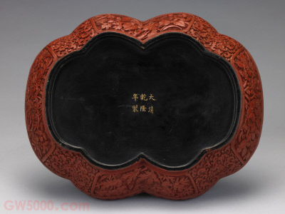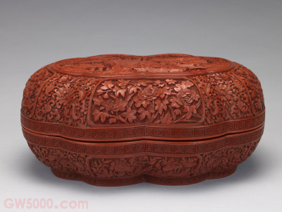 盒呈云头式,通体髹红漆,盖面雕曲水流觞图。盖壁和盒壁各有四个开光,内装饰锦地花卉纹。器内及外底髹黑漆,外底中部刀刻填金楷书“大清乾隆年制”款,盖内中部刀刻填金楷书“兰亭宝盒”名色签。从水波纹细如发丝的特征推断,此件漆盒应由造办处发样,旨令苏州织造制作而成。