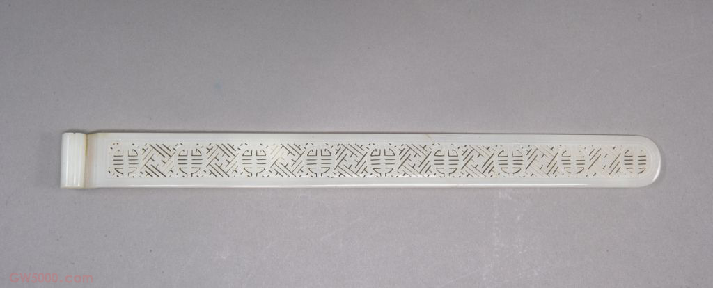 青白玉扁方,清,长32.30厘米,宽2.90厘米。清宫旧藏。 清代后妃所用扁方是簪中最有特色者,又称“大扁簪”。贯穿于发髻之中,多以金、银、玉等材料制成。此扁方白玉质,玉质温润。扁长体,头为五朵梅花形。簪身镂空寿字与万字相间,表面抛光。清代贵族妇女插发用的头饰。宫廷中所用扁方多为玉制,也有珊瑚、翡翠、金镶玉和玉嵌宝石等制品。 镂空是瓷器的装饰技法之一,也被称作“镂花”或“透雕”。它是将器物胎体上的纹样镂通,形成内外通透的图案。 玻璃制作的最后一道工序。即在器物制成后,将其表面磨平、磨光,显现出玻璃质的内蕴光泽。抛光的精与粗直接影响器物的艺术水平,因此至关重要。