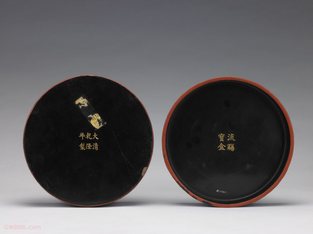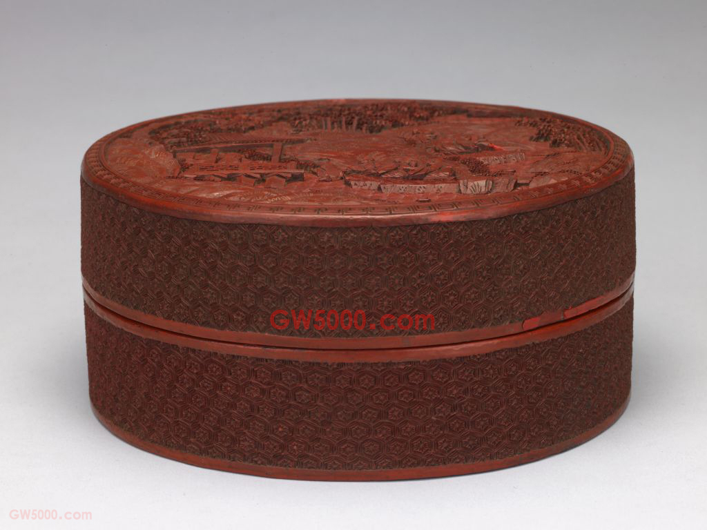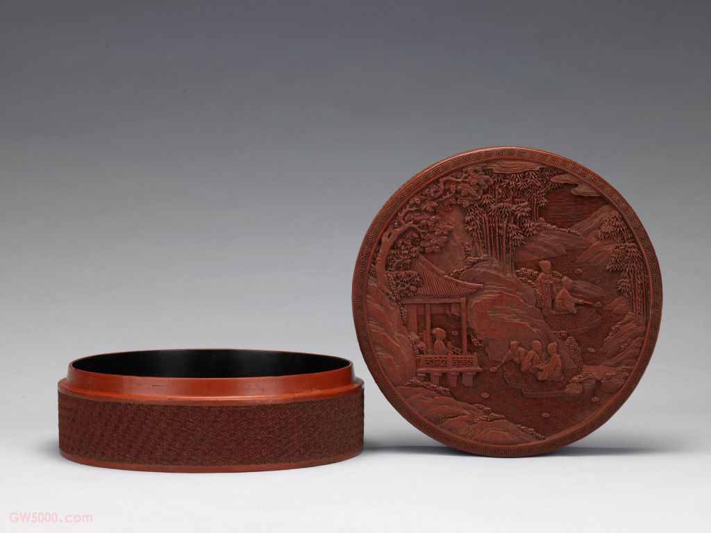 剔红山水人物流觞图扁圆盒,清乾隆,高 8.3厘米,口径 17.8厘米。 蔗段式,子母口,平底,通体髹红漆 ,盒内及外底髹黑漆。盖面雕曲水流觞图。盖面边沿雕连续回纹,盖壁和盒壁均刻六角形锦地。盖内中央刀刻填金楷书“流觞宝盒”器名款,外底中央刀刻填金楷书“大清乾隆年制”款。 乾隆时期的御用雕漆由清宫造办处发样,苏州织造负责制造。剔红流觞宝盒与剔红兰亭宝盒盖面的曲水流觞图构图相同,应是同样的稿样。雕漆品种之一,又名“雕红漆”或“红雕漆”。此技法成熟于宋元时期,发展于明清两代。明黄成《髹饰录·坤集·雕镂第十·剔红》中写道:“剔红,即雕红漆也。……宋元之制,藏锋清楚,隐起圆滑,纤细精致。”其法常以木灰、金属为胎,在胎骨上层层髹红漆,少则八九十层,多达一二百层,至相当的厚度,待半干时描上画稿,然后再雕刻花纹。一般以锦纹为地,花纹隐起,华美富丽。根据漆色的不同,有剔红、剔黄、剔绿、剔黑、剔彩、剔犀之分,其中以剔红器最多见。<P> 明代永乐、宣德时期果园厂所制雕漆的典型器形之一。蔗段式盒主要特征为圆形、平顶、直壁、矮卧足或无足。器物口径大多在15-30cm,高在10cm以内,也有大于30cm以上者。清初高士奇在《金鳌退食笔记》中记载:“明永乐年制漆器……剔红盒有蔗段、蒸饼、河西、三撞、两撞等式。”与现存永乐漆器正相印证。</P> 旧时汉族岁时风俗,流行于我国多数地区,为夏历三月三日上巳节期间的一种游戏活动。觞,即酒杯,一般为木制,故可在水中飘浮。每年三月三上巳节,人们坐在环曲的水渠旁,在上游放置酒杯,任其顺流而下,杯停在谁的面前,谁即取饮,以此为乐,故称“曲水流觞”。此俗起源甚早,周代已有。晋永和九年三月初三,王羲之等在会稽(今绍兴)兰亭修禊,他们吟诗、饮酒,遂作《兰亭集序》:“又有清流激湍,映带左右,引以为流觞曲水。”清代次俗限于宫廷举行。今北京潭柘寺、中南海均存“流杯亭”之建筑。