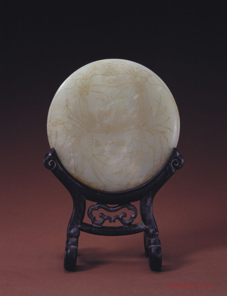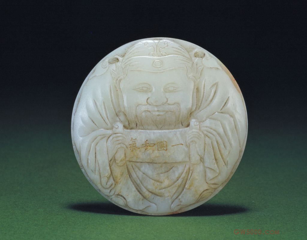 青玉“一团和气”插屏一对,明,径8.8-8.9厘米,厚1.4-1.5厘米。