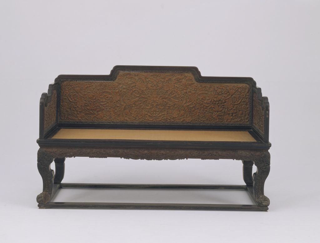 清中期,高107.5厘米,长177厘米,宽80.5厘米。 宝座紫檀木制,面上三屏风式座围,靠背及两侧扶手攒框镶楠木心,平雕万字纹锦地,锦地之上浮雕西洋风格的卷草纹。座面藤心软屉,面下有极窄的束腰与牙条,系一木连作。牙条与腿足亦满雕西洋卷草纹。三弯式腿,上节雕展腿,下节外翻足,足下承托泥。此宝座造型美观华丽,雕工一丝不苟,为清代家具中之艺术精品。传统家具中一种体型宽大的坐具,亦称“御座”。明以后,随着皇权制度的强化,宝座成为帝王御用坐具的代名词,象征着帝王的权威。《明史》载,明神宗时,宦官冯保窃权,“帝御殿,保辄侍侧”。当时的吏部都给事中雒遵进言:“保一侍从之仆,乃敢立天子宝座,文武群工拜天子耶,抑拜见中官耶?”将宦官立于宝座之侧视为亵渎皇权的大不敬行为。 宝座大多摆放在宫廷正殿明间的中心或显要位置,单独陈设,极少成对。在宝座的背后还要放置一个较大的座屏,两边放置甪端、香筒、仙鹤、蜡钎等器物,格外尊贵、庄严。皇帝端坐在宝座之上,俯视群臣,“君临天下”,充分体现出帝王的权威,以达到“明制度,示等威”的目的。紫檀木是世界上最名贵的木材之一,主要产于南北回归线之间的热带、亚热带地区,我国广东、云南等地有少量出产。其木质坚硬,体重,入水即沉,没有疤痕,呈紫黑色。紫檀木生长缓慢,非数百年不能成材,故极珍贵。紫檀木的纹理纤细浮动,变化无穷,其色调深沉,显得稳重、大方、美观。《博物要览》称:“新者色红,旧者色紫,有蟹爪纹,新者以水浸之,可染物。”我国古代使用紫檀木制作器物历史悠久,东汉末年已见于记载,唐代宫廷中亦有使用紫檀木的记载。至明代,紫檀木更是受到皇家的宠爱。清代,紫檀木大量进入宫廷中,为内务府造办处用于制作清宫家具及文玩之器的必备材料,同时一些富商大贾之家也多使用名贵的紫檀木制造家具及生活用品。 屏风是我国古代室内的主要陈设器物。其最早的功能为挡风和遮避用。据《三礼图》记载:“屏风之名出于汉世,故班固之书多言其物。”以后随着工艺的进步,屏风逐渐由原来的实用品演进为实用性和装饰性结合的工艺品,成为古人居室内具有观赏性的陈设家具。屏风在清代发展尤盛,无论是所用材料还是工艺技术都达到了历史最高水平。 亦称欹床。中国传统家具中的一种坐具,现已很少见。其形式犹如椅子的靠背,是一种无座腿甚至无座面的坐具。其背后安有可以撑放的活动支架,可根据使用者的要求调节靠背的角度。它多在床榻上或席地使用。明高濂《遵生八笺》中说:“靠背以杂木为框,中穿细藤,如镜架然。高可二尺,阔一尺八寸,下作机扃,以准高低,置之榻上,坐起靠背,偃仰适情,甚可人意。”宋、明绘画中也可见到此种坐具。中国古代家具上用攒边方法做成的框称为攒框。楠木产自我国四川、云南、广西、湖北、湖南等地,为常绿乔木,高十余丈,叶为长椭圆形。传说这种木材水不能浸,蚁不能穴,南方人多用作棺木或牌匾。楠木美观,但不如硬木华丽。 锦原为丝织物的种类名,花纹精致古雅。漆器上所谓锦地,是指用漆填或描绘出华美的纹样作衬地,其上再饰各种图案。 在平面上雕出凸起的纹饰或物象的一种雕塑。按凸起高度的不同,可分为高浮雕、深浮雕、浅浮雕等,也有几种雕刻技法结合使用的形式,多见于高精繁杂的雕刻作品。 瓷器纹饰,又称卷叶纹或卷枝纹,宜于作各种器物的辅助纹饰。 17、18世纪传入中国的一种装饰花纹。俗称西蕃莲,如果没有花朵,则称为卷草。用棕藤、丝绒或其它纤维编织的家具屉面。束腰,明清家具部件名称。原是须弥座上枭与下枭之间的部分,在家具上指面框和牙条之间缩进的部。束腰是我国传统家具造型的典型式样之一。很多家具在立木与横木的支架交角处多运用形式不同的牙子来装饰。这种牙子中长而直的称为牙条。在家具制作中,家具的两部分不用两块木料拼接,而用一块木料制作,称“一木连作”。一种“S”形线形的腿。俗称“三弯腿”。一木连作两层腿,或短腿下另接活腿以增加高度的作法俗称“展腿”。传统家具上承接腿足的部件。明清家具中有的腿足不直接着地,另有横木或木框在下承托,此木框即称为“托泥”。有的托泥之下还有小足,小足才是真正落地的部位。此部件多见于条案、几类等传统家具,以增稳重之感。雕镂之工。