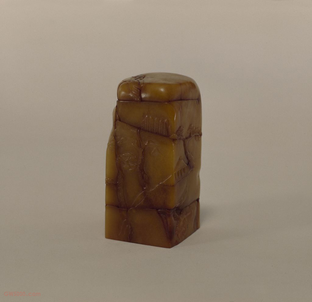 “嘉庆宸翰”印,清嘉庆,寿山石质,通体浅浮雕松石小景。汉文篆书。面3.3厘米见方,通高7.5厘米。 此宝质地一般,有微细裂痕,颜色深浅不一,但治印者因形就势,用浅浮雕技法雕出苍松、山石、亭榭,布局恰到好处,巧妙地掩盖了石材本身的瑕疵,堪称妙品。此宝在嘉庆帝御笔上钤用较多。 帝王的文章或手书。叶腊石之一种,产于福建福州市郊寿山,因名寿山石。质地细腻,色彩丰富,其中以各种透明或半透明的冻石品质为高。寿山石是雕刻和治印的优良材料。在平面上雕出凸起的纹饰或物象的一种雕塑。按凸起高度的不同,可分为高浮雕、深浮雕、浅浮雕等,也有几种雕刻技法结合使用的形式,多见于高精繁杂的雕刻作品。