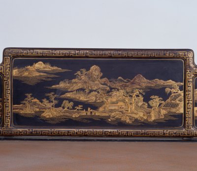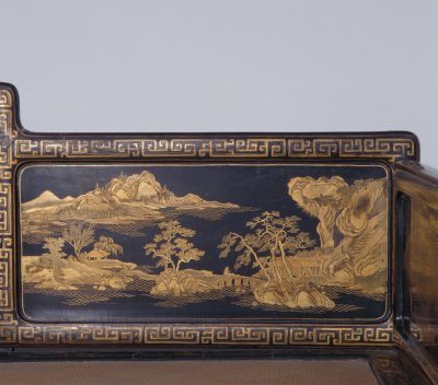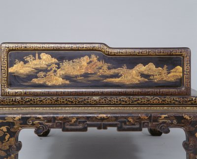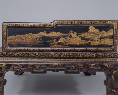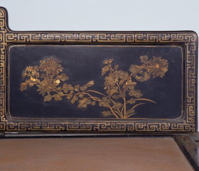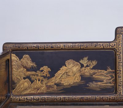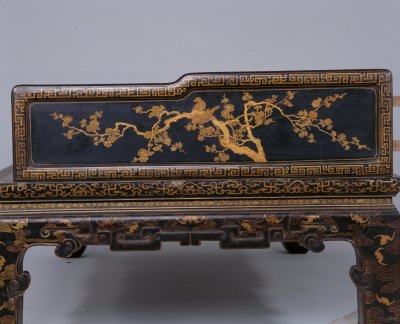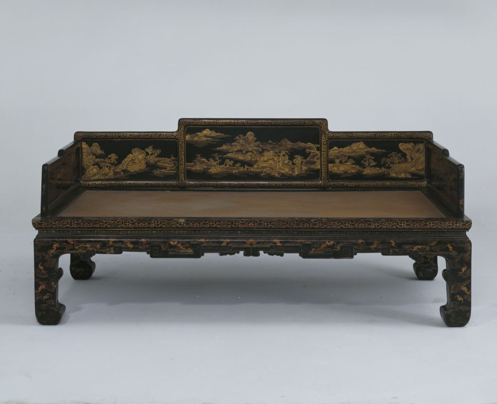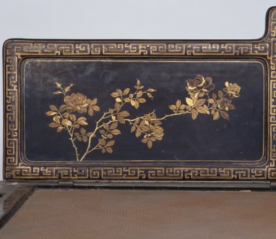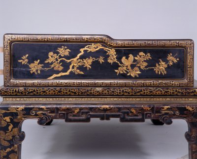 清雍正,高89.5厘米,长205厘米,宽110.5厘米。 床身通体髹紫漆,描金装饰各类花纹,藤心床面。床面下有束腰,洼堂肚牙板与腿相连,直腿内翻马蹄,均装饰描金卷草及云蝠纹。床面的左右后三面装七屏式围子,攒框镶心两面装饰花纹。边框饰回纹,板心饰山水风景。此床制作工艺精堪,绘画精美,是清代雍正时期的艺术精品。瓷器装饰手法之一。其工艺是以毛笔蘸调和好的金粉,在烧好的瓷器上描绘图案花纹,然后入炉经低温烘烧而成。描金创烧于北宋定窑,南宋人周密《志雅堂杂钞》记载:“金花定碗用大蒜汁调金描绘,然后再入窑烧,永不复脱。”用大蒜汁调和金粉是利用其天然的粘性。明清的景德镇御窑厂亦常用描金装饰颜色釉瓷器,如著名的宣德鲜红釉描金器、弘治黄釉描金器、乾隆窑变釉描金器等。 束腰,明清家具部件名称。原是须弥座上枭与下枭之间的部分,在家具上指面框和牙条之间缩进的部。束腰是我国传统家具造型的典型式样之一。清式家具的装饰手法之一,牙条正中下垂的曲边装饰线角称为“洼堂肚”。家具部件名称。一般指面框或束腰下设置的连接于两腿之间的部件。设在其它部位的一般称为牙条。明清家具的腿足装饰,足端向里翻称“内翻马蹄”,向外翻称“外翻马蹄”。17、18世纪传入中国的一种装饰花纹。俗称西蕃莲,如果没有花朵,则称为卷草。带座屏风的一种。有三屏、五屏、七屏、九屏几种。 中国古代家具上用攒边方法做成的框称为攒框。家具板面通用的一种传统作法。由大边、抹头、穿带和面心组成,面心四边作出榫舌,大边和抹头作出榫槽,将面心镶在榫槽内,木工术语称之为“攒框镶心”。家具上常用的纹饰之一,由陶器和青铜器上的雷纹衍化而来,寓意吉利深长,苏州民间称之为“富贵不断头”。在家具上,回纹主要作为边饰,用于边框、牙条、足端或束腰等处。家具上大量采用回纹见于清代。