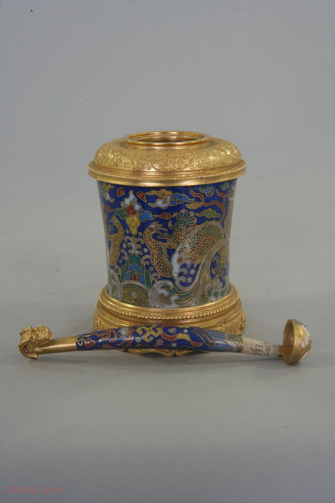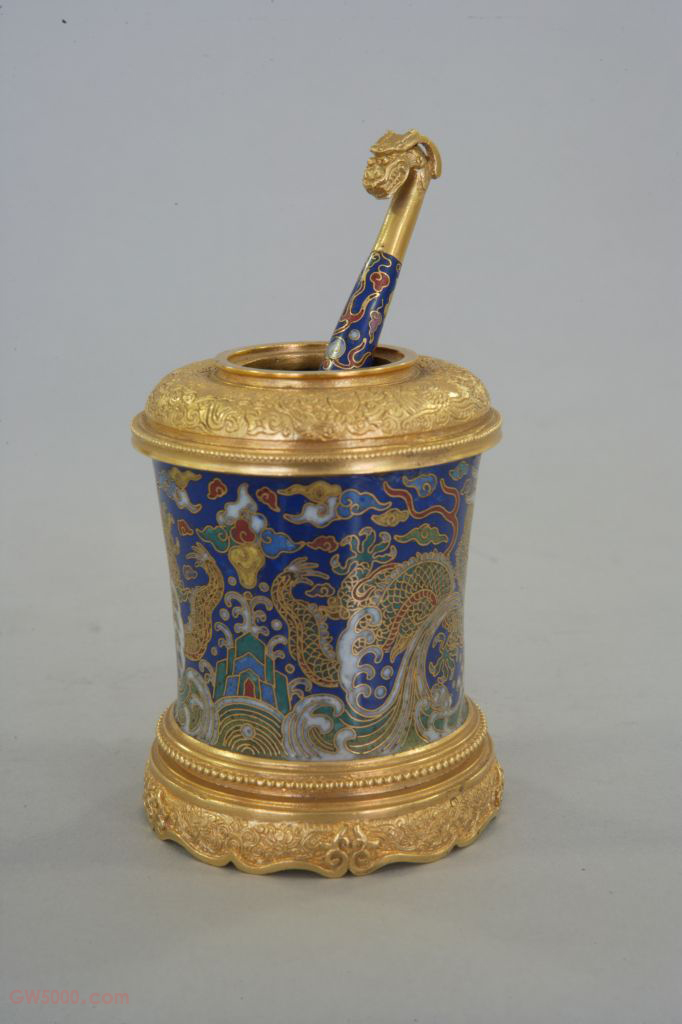 乾隆款掐丝珐琅双龙纹水丞,清乾隆,高9.1厘米,口径3厘米。 水丞敛口,壁微有内凹,平底,圈足。腹壁以宝蓝色釉为地,采用红、黄、绿、蓝、白等色珐琅釉,装饰海水江崖云龙纹,双龙相对处有一“卍”字结。整幅图案寓意江山万代。器口、圈足及底鎏金,口部以莲纹为间隔,錾刻五只形态各异的凤鸟。足沿錾刻缠枝莲纹。外底长方框内有“大清乾隆年制”阳文楷书款,框外浮雕双龙还抱纹。水丞内置一铜鎏金龙首匙。 俗称“景泰蓝”。以红铜作胎,将很细的铜扁丝掐成花纹后用药焊于器表,再以随类附彩的方法将珐琅釉料填进丝间,经焙烧、打磨、镀金而成。 珐琅,又称“佛郎”“法蓝”“琺瑯”,是一外来语的音译词。珐琅的基本成分为石英、长石、硼砂和氟化物,与陶瓷釉、琉璃、玻璃(料)同属硅酸盐类物质。中国古代习惯将附着在陶或瓷胎表面的称“釉”;附着在建筑瓦件上的称“琉璃”;而附着在金属表面上的则称为“珐琅”。 金属胎珐琅器则依据在制作过程中具体加工工艺的不同,可分为掐丝珐琅器、錾胎珐琅器、画珐琅器和透明珐琅器等几个品种。陶瓷器装饰纹样之一种。明、清两代是陶瓷器以龙纹为装饰的全盛时期,主要采用釉上、釉下彩绘方法,亦有印花、刻划等工艺。龙的体态有较多变化,常见有云龙、戏珠龙、海水龙、螭龙、行龙、立龙、正面龙、侧面龙、夔龙等。水丞文房用具之一,用以贮水,器形大多口底相若,扁腹。两晋时期烧制的青釉水丞有蛙式者。唐代越窑烧制青釉水丞,有蛙、蟾蜍式。长沙窑则烧制釉下彩及三彩水丞。明清时期景德镇窑烧制了各式水丞,有青花、釉里红、五彩、粉彩、天蓝釉、粉青釉、红釉、仿官、仿哥釉等品种。除瓷制外,还有玉制水丞、料器水丞。 古代金属工艺装饰技法之一。近代称“火镀金”。此术在春秋战国时已出现。汉代称“金涂”或“黄涂”。鎏金是将金和水银合成金汞剂,涂在铜器表面,然后加热使水银蒸发,而金则附着于器面不脱落。 金属工艺的一种。即用工具剔除地纹,使纹饰轮廓线凸起。錾金工艺技法早在商代就已出现,到清代,被广泛地运用于各种金属工艺品上。中国传统装饰花纹之一。所绘花朵系以植物的枝干或蔓藤作骨架,枝叶相互缠绕,构成四方连续或二方连续的图案,统一中寓变化。有缠枝莲、缠枝菊、缠枝牡丹和缠枝宝相花等多种纹样。 中国传统装饰花纹形式之一。其绘花朵上下周转,枝叶相互缠绕成图案形式,有缠枝莲、缠枝菊、缠枝牡丹等。以莲花为主题者,称缠枝莲。莲花是随佛教的传入而在中国的工艺品上流行开的。魏晋南北朝时佛教艺术在中国大为盛行,莲花便作为佛的象征而广泛出现在中国的工艺品上。南北朝时瓷器上的莲花瓣装饰十分普遍,成为这一时期瓷器装饰的标志性的纹样。此后,莲花就成为瓷器装饰中最普遍的纹样之一。 篆刻的一种方式,即把印文镌成凸状,在纸上钤盖时印文是红色,因而又称为朱文。 在平面上雕出凸起的纹饰或物象的一种雕塑。按凸起高度的不同,可分为高浮雕、深浮雕、浅浮雕等,也有几种雕刻技法结合使用的形式,多见于高精繁杂的雕刻作品。