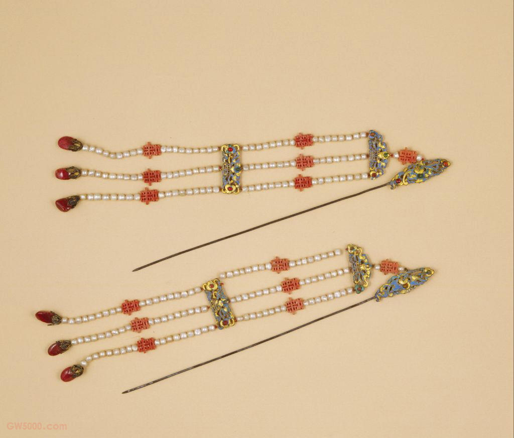 流苏由银钎和三串珍珠构成。银钎顶端为银镀金点翠云蝠纹饰,两端嵌红宝石。云蝠有孔穿环,与三串珍珠相连。三串珍珠每串为34颗,共计102颗。每串珍珠有珊瑚制成的喜字结珠两枚,珠下端有红宝石坠角。两块结牌将三串珍珠相连,结牌作银镀金点翠云蝠纹,两端各嵌红宝石一块。