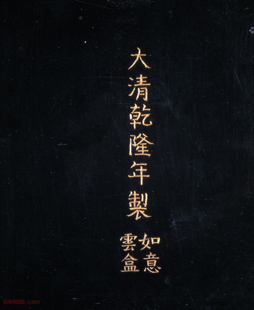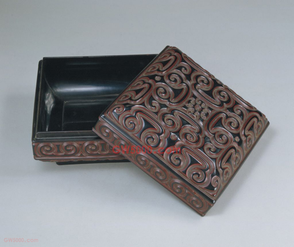 剔犀如意云纹方盒,高12.3厘米,口径17厘米。 盒木胎,正方形,盖中部微隆起,器身下敛,接方圈足。器表用黑、黄二色漆分层反复髹成。盖面雕对称的如意云纹8个,中心雕柿蒂纹。器壁亦雕云纹。足内黑光漆,中心刀刻填金楷书“大清乾隆年制”直行六字款,款下又刻“如意云盒”双行四字。 此盒造型方正规矩,用漆精良,雕刻精细,纹饰对称工致,是乾隆朝官造漆器之精品。 雕漆品种之一。其工艺是用二色或三色漆在器物上有规律地逐层髹涂,至一定厚度,再雕刻花纹,刀刻花纹的侧面露出不同色漆的纹理。此种工艺的纹饰多为如意云纹或蔓草纹。剔犀是雕漆中最早出现的品种之一。