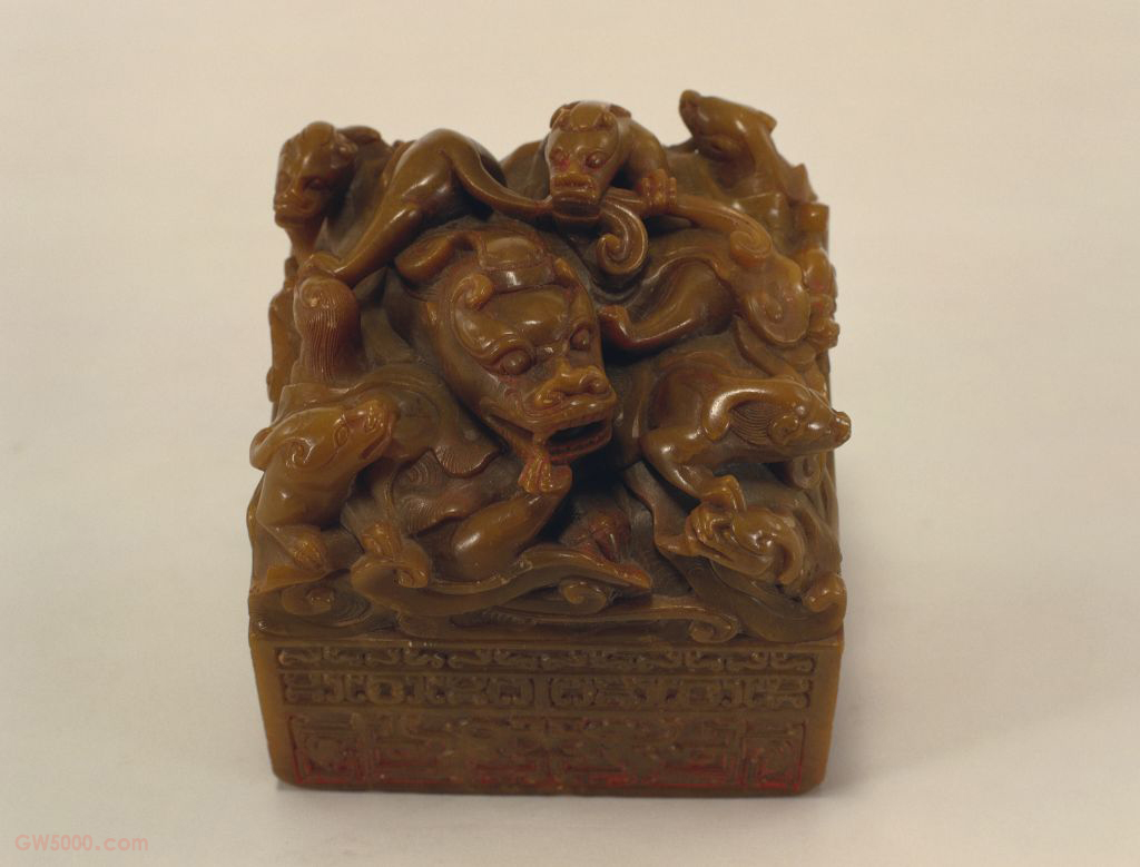 “嘉庆御笔之宝”,清嘉庆,寿山石质,夔龙纽方形玺,汉文篆书。面8.6厘米见方,通高8.5厘米,纽高4.1厘米。 此宝周边满刻浅浮雕夔龙及博古纹饰,上部雕夔龙出没于云间,体态生动,其质地与四边纹饰、纽雕等都与康熙朝晚期的寿山石印章风格一致,说明此玺是嘉庆时利用宫中收藏的旧宝改刻的。这也是帝后宝玺制作过程中的正常现象。叶腊石之一种,产于福建福州市郊寿山,因名寿山石。质地细腻,色彩丰富,其中以各种透明或半透明的冻石品质为高。寿山石是雕刻和治印的优良材料。夔,古代传说中一种奇异的动物,似龙,一足。《庄子·春秋》中记载:“夔谓蚿曰:‘吾以一足趻踔而行。’”夔纹即这种独脚龙的侧面图案。玉器上的夔纹,最早见于商、西周时期,多见于彝器上。夔纹在玉器上出现的时间很长,自商、周至今,一直在玉雕工艺纹饰中占据着重要地位,而在战国和汉代尤为兴盛。玉器上的夔纹线条比青铜器上的柔和,阴刻线除单线外,也有双刻线。 在平面上雕出凸起的纹饰或物象的一种雕塑。按凸起高度的不同,可分为高浮雕、深浮雕、浅浮雕等,也有几种雕刻技法结合使用的形式,多见于高精繁杂的雕刻作品。 以多种古代器物如古铜器、古玉器、古瓷器等为图形作装饰的纹样叫博古纹。