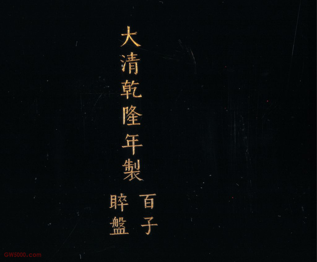 百子是指画面中数十幼儿,“睟”通“晬”,指儿童满周岁。据宋人谢维新《合璧事类》记载:“周岁陈设曰睟盘”。古代风俗,幼儿周岁时,在盘中置放各种器物,任其拈取,以为征兆。此百子睟盘当是清代宫廷在王子周岁时陈放各种器物的用具。