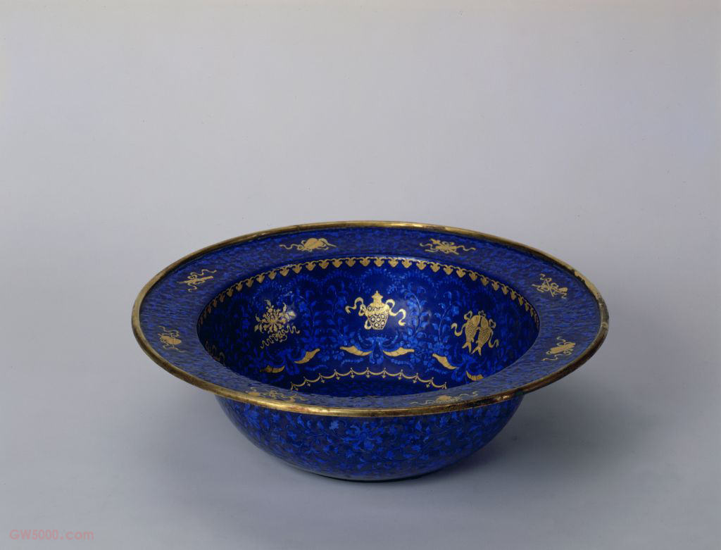 透明珐琅八吉祥纹面盆,清乾隆,高14厘米,口径47.5厘米,足径34厘米。 面盆折边,口沿鎏金,矮圈足。盆内外壁均以银片贴饰花卉纹,上面通罩宝蓝色透明珐琅釉,银片花纹透过珐琅釉若隐若现,具有朦胧之美。釉上又贴金片做装饰,内壁、折边分别饰八吉祥纹与暗八仙纹,金光闪烁。 透明珐琅是广珐琅中独有的工艺品种,特色是精美华丽,富贵气派,因而成为贡品。由于制作复杂,历史上制作稀少,能够完好流传至今者,凤毛麟角,十分珍贵。 即广州制作的珐琅器之简称。清代,广州制作珐琅器的水平较高,因此宫廷常命令广州为内府制作器物,有时还就造型、装饰花纹、款识等提出具体要求和规定。因此,广珐琅仍属官制品范畴。广珐琅与宫廷制作的珐琅器有一定的区别,前者的胎体较薄,珐琅釉色较浓艳。用开光法进行装饰是广珐琅的显著特点。珐琅,又称“佛郎”“法蓝”“琺瑯”,是一外来语的音译词。珐琅的基本成分为石英、长石、硼砂和氟化物,与陶瓷釉、琉璃、玻璃(料)同属硅酸盐类物质。中国古代习惯将附着在陶或瓷胎表面的称“釉”;附着在建筑瓦件上的称“琉璃”;而附着在金属表面上的则称为“珐琅”。 金属胎珐琅器则依据在制作过程中具体加工工艺的不同,可分为掐丝珐琅器、錾胎珐琅器、画珐琅器和透明珐琅器等几个品种。佛前供器,藏文称之为“八吉祥相”。由法轮、法螺、宝伞、白盖、莲花、宝罐、金鱼、盘肠八件组成。每件供器含义不同:轮代表佛说大法圆转,万劫不息;螺代表菩萨果妙音吉祥;伞代表张弛自如,曲覆众生;盖代表遍覆三千,净一切乐;花代表出五浊世无所染;罐代表福智圆满,具完无漏;鱼代表坚固活泼,能解坏劫;肠代表回环贯彻,一切通明。因为八宝寓意吉祥,所以成为我国传统工艺中的主要纹饰。 古代金属工艺装饰技法之一。近代称“火镀金”。此术在春秋战国时已出现。汉代称“金涂”或“黄涂”。鎏金是将金和水银合成金汞剂,涂在铜器表面,然后加热使水银蒸发,而金则附着于器面不脱落。 古建筑彩画绘画的一种题材。清代中期之前多画绿叶子花卉,清代晚期画黑叶子花卉。又名烧蓝,由欧洲传入。此种工艺是在金、银、铜胎上涂透明珐琅料,以低温烧成。其过程多是在器表錾刻纹饰,然后涂抹蓝、绿、紫、黄、白等各种釉色,或加贴金、银花片等,透过珐琅呈现出光彩夺目、华丽璀璨的效果,具有很高的欣赏价值。清代,仅在广州有制作,故又名广珐琅。 中国传统装饰纹样之一。八仙指神话传说中神通广大的道家神仙铁拐李、汉钟离、蓝采和、张果老、何仙姑、吕洞宾、韩湘子和曹国舅,他们各持一件宝物,分别是葫芦、扇子、花篮、渔鼓、荷花、宝剑、洞箫和玉板,传说这些宝物法力无边,有逢凶化吉之作用,其被用作装饰图案,以物代人,称暗八仙。 “八仙”乃古代神话传说中的8位神仙:铁拐李、汉钟离、蓝采和、张果老、何仙姑、吕洞宾、韩湘子与曹国舅。 我国古代金工传统工艺之一。用小锤敲击各种大小不同的金属錾子,在金属表面留下錾痕,形成各种不同的纹理,使单一的金属表面产生多层次的立体装饰效果。此种工艺始于春秋晚期,盛行于战国,至今依然为匠师们沿用。