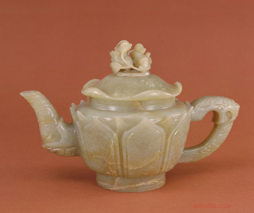 青玉鸳鸯卧莲云龙柄执壶,明,口径9.7厘米,底径7.6厘米,高15.6厘米。