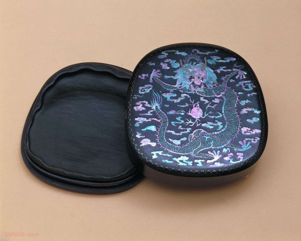 歙石荷叶式砚,清乾隆,长14.5厘米,宽13厘米,厚2.5厘米。清宫旧藏。 砚为歙石制成,随形雕琢为卷边荷叶形。砚面上部深雕与荷叶卷边掩映为砚池;背面微凹,中间凸起浮雕荷叶蒂,构思巧妙。 此砚石质精良,色青紫黑,石肌纹理细密,隐现细密牛毛纹,古犀罗纹,尤其以眉纹成双成对分布,悦目怡神。造型设计精巧,刀法简练,自然浑圓,为歙石砚中珍品。 原配有黑漆嵌螺钿云龙戏珠纹盒,装饰华美,为清乾隆时期御用砚佳品。 歙石纹理之一,如丝罗状。罗纹也分十几种,有角浪水波纹、算子罗纹、金花罗纹等。纹分粗、细,以细密纯净者为上品。 砚的中心研墨处。为砚较为空白开阔的部位,又称墨堂、砚心。此处便于研墨,利于旋转,易于运动。砚的实用价值即视砚堂处石质的好坏而定。 砚面贮墨汁处,或称墨池,多为深凹小池。砚池多有富于装饰性者,以安排之巧、形状之奇或纹饰雕刻取胜。指取材于各种贝壳色泽光华最佳的部位,分层剥离和裁制后镶嵌于木、漆器之上作为装饰。《髹饰录》中描述道:“螺钿……百般文图,点、抹、钩、条,总以精细密致如画为妙。又分截壳色,随彩而施缀者,光华可赏。”意即按照画面花纹的需要,采用不同色泽的螺片,裁切成各种不同的形状,镶嵌出各种画面,达到近似设色的效果。 中国传统装饰工艺之一,即指将螺、贝、蚌等软体动物的体壳加工成薄片,刻划并拼组成花草、人物、鸟兽等纹样,镶嵌于漆、木等器物表面的装饰技法,也作“螺甸”、“螺蜔”、“螺填”、“陷蚌”等。其起源甚早,在陕西、河南、北京等地发掘的西周墓葬里都出土过镶嵌蚌泡的漆器,有的学者认为这就是螺钿工艺的滥觞,目前所见比较成熟的螺钿器物是出土于唐墓内的漆背螺钿铜镜和收藏在日本奈良正仓院的螺钿玳瑁八角盒、螺钿紫檀琵琶等。宋代的螺钿器物比较普遍,《髹饰录》所记的“壳片古者厚而今者渐薄”的薄螺钿(或称软螺钿)工艺,一般认为就是在此时开始出现,并逐渐占据主流位置,同时厚螺钿(或称硬螺钿)工艺也并未消失,在大型家具的装饰中还形成独特风格。元明时期,螺钿工艺所使用的贝壳品种更为丰富,加工更为精细,发展出加彩漆、描金、金箔、金银嵌错和加“沙”(即撒壳屑)等辅助手法,创造出五色斑斓的效果,正如《髹饰录》所言:“百般文图,点、扶、钩、条,总以精细密致如画为妙。”至17世纪,螺钿工艺达到高峰,产生了江西吉安等主要产地,涌现出江千里、方信川等著名匠人。入清后,薄螺钿工艺进一步向轻巧细致发展,受嵌器物的材质也趋于多样,除漆、木外,玉石、象牙、金属等都有嵌螺钿装饰的实例。清中期以后,螺钿作为百宝嵌工艺中诸多镶嵌材料的一种,往往与宝石、玉翠、象牙等共同出现,单独的螺钿器反而少见了。清代螺钿工艺产地可能集中在扬州、广州等地,内廷造办处也能制作,名匠见诸记载的则有王国深、卢映之、卢葵生等人。
