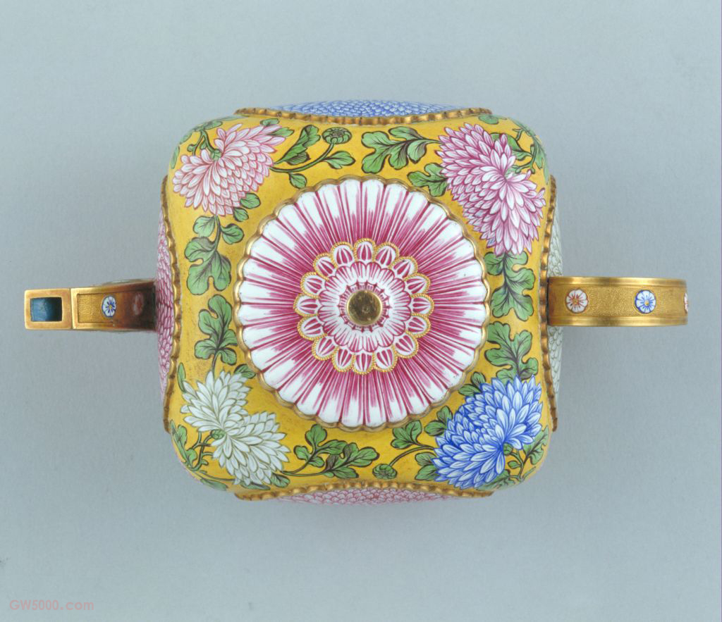 壶方体圆角,曲流,环柄,壶口及盖均制成菊瓣式以相互吻合。壶身四面均凸起菊瓣式开光,内绘大朵盛开的菊花,花瓣层层叠叠,有层出不穷之感。开光外绘折枝菊花纹。盖面绘大朵菊瓣纹,柄、流均绘小朵团菊。足内白釉,中心蓝色双圈,内书“乾隆年制”四字款。