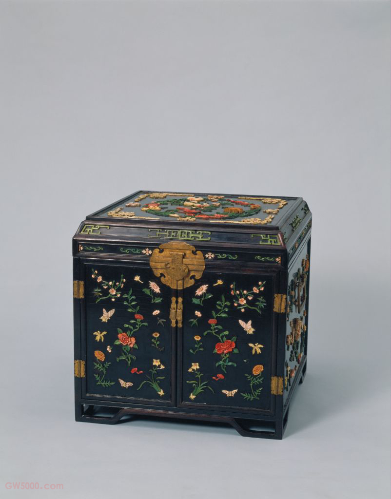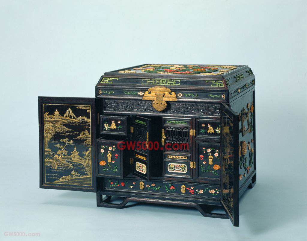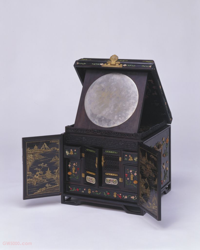 妆奁的装饰采用了染牙和描金工艺。在漆地上挖槽,将反复琢刻、打磨的各式染牙嵌件通过粘、镶的手法填入槽中,组成多种图案。顶部有蝙蝠、桃、菊花、如意纹,角隅处饰莲花,正面镶对称的梅、菊、水仙、山茶等花卉,其间有纷飞的彩蝶。其余三面均嵌梅、蝶纹。茶花与蝴蝶寓意“地久天长”,蝙蝠、桃、如意寓意“福寿如意”。妆奁顶部又饰有描金莲花、蝙蝠,双门内壁描金山水楼阁,此外,妆奁还使用了雕刻工艺,可谓集多种工艺于一器。整件器物古香古色,富贵华丽,是清中期的优秀工艺品。在黑色漆地上加描金花纹的工艺技法。瓷器装饰手法之一。其工艺是以毛笔蘸调和好的金粉,在烧好的瓷器上描绘图案花纹,然后入炉经低温烘烧而成。描金创烧于北宋定窑,南宋人周密《志雅堂杂钞》记载:“金花定碗用大蒜汁调金描绘,然后再入窑烧,永不复脱。”用大蒜汁调和金粉是利用其天然的粘性。明清的景德镇御窑厂亦常用描金装饰颜色釉瓷器,如著名的宣德鲜红釉描金器、弘治黄釉描金器、乾隆窑变釉描金器等。